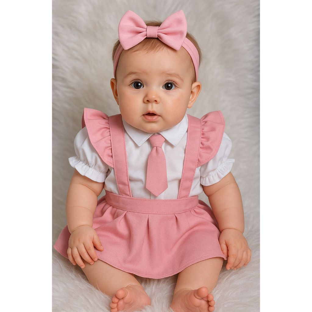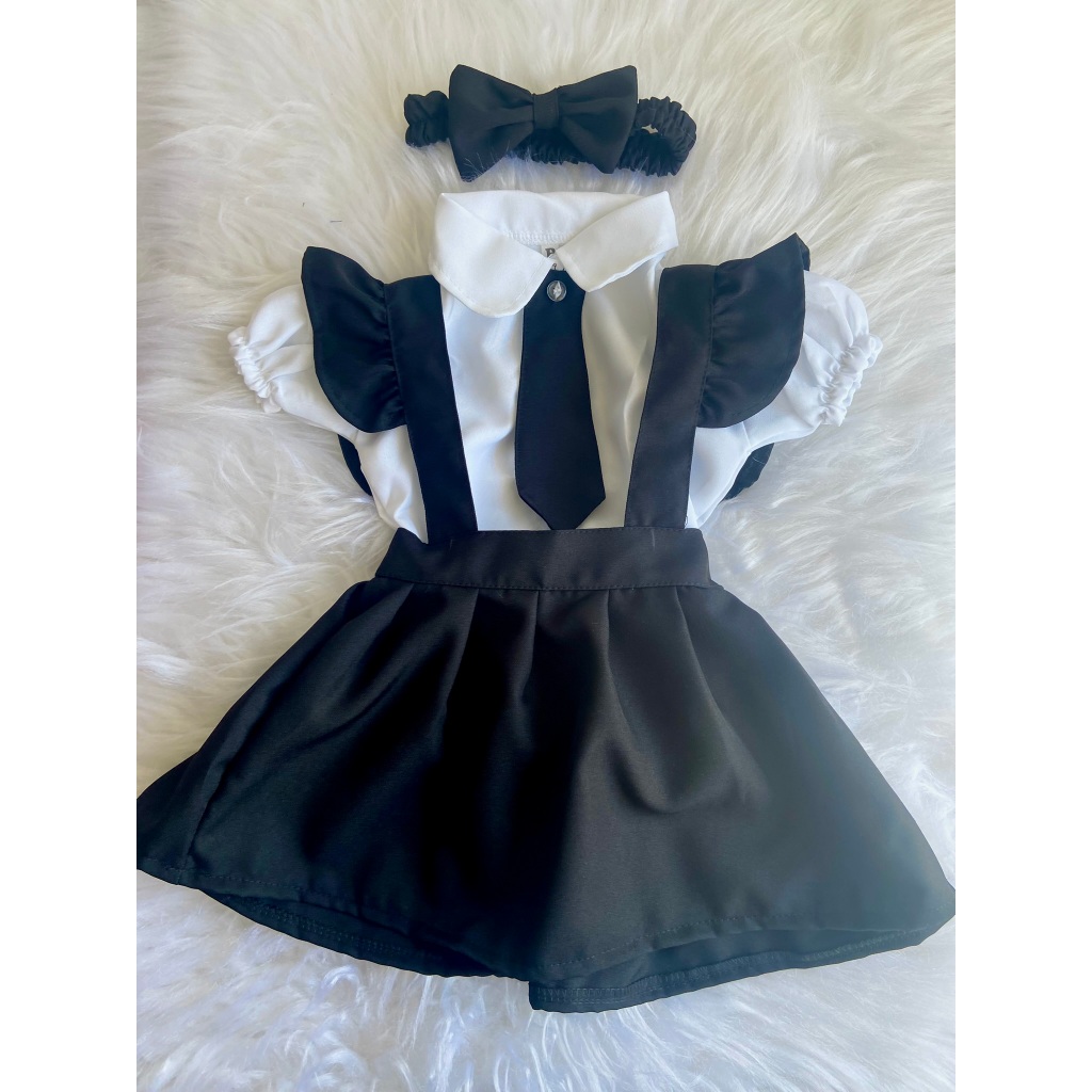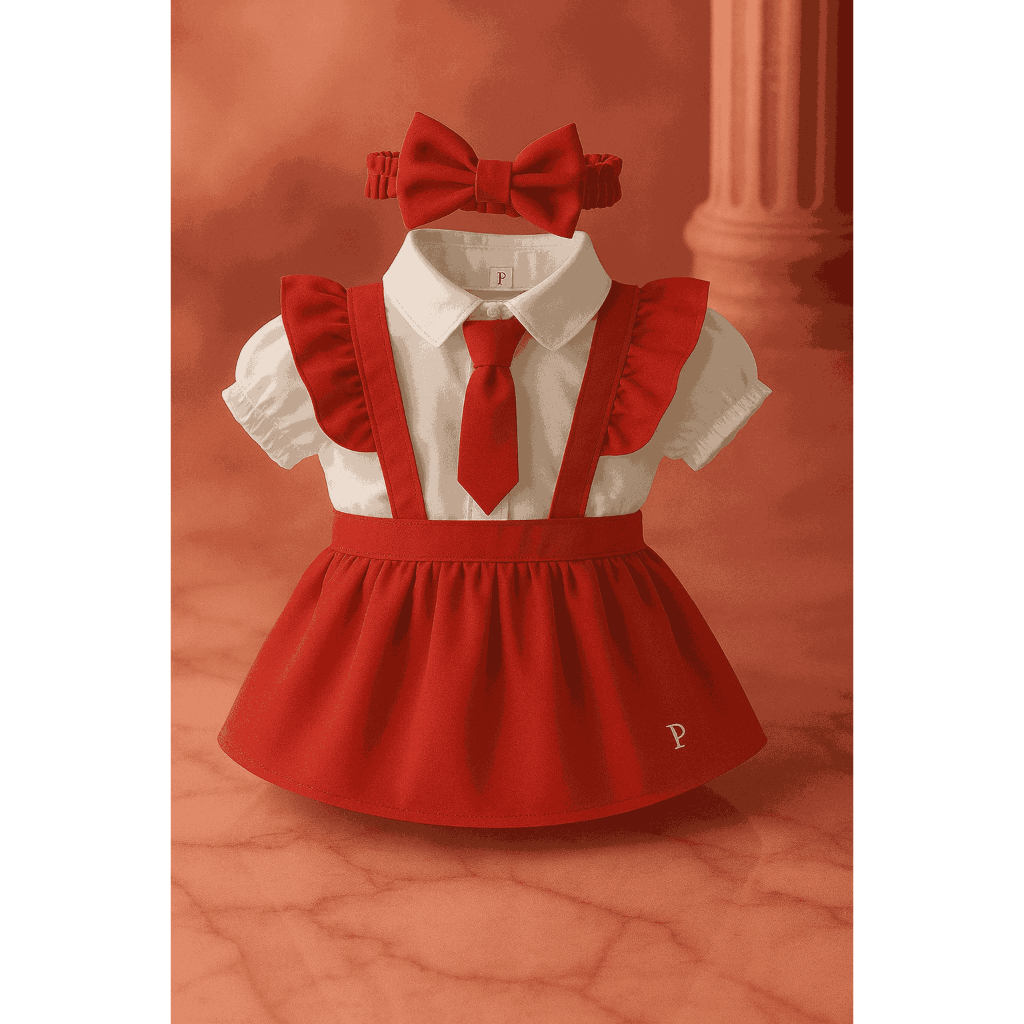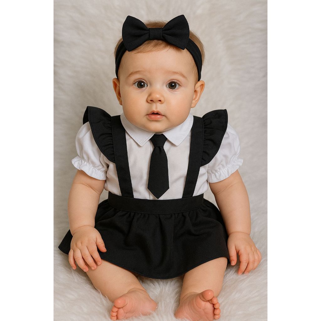 Conjunto Infantil Social Menina – Camisa Branca com Gravata, Saia Preta + Brinde Faixa de Cabelo, Verde Vermelho Preto