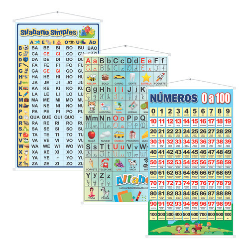 Kit 3 Banners De Apoio Pedagógico Sílabas Silabário Simples Alfabeto Números - 60 cm x 100 cm