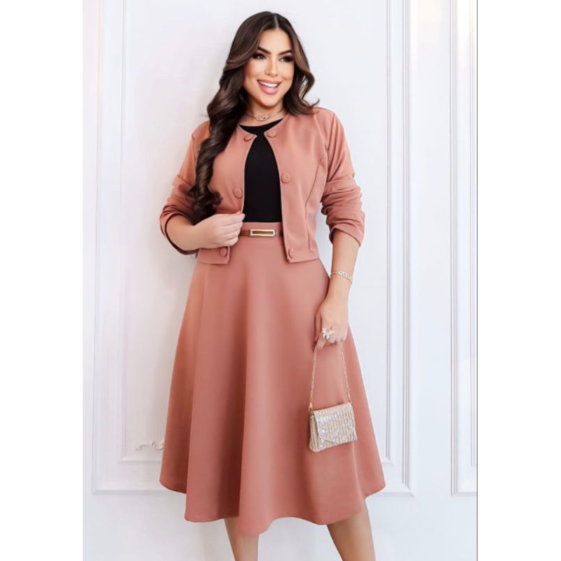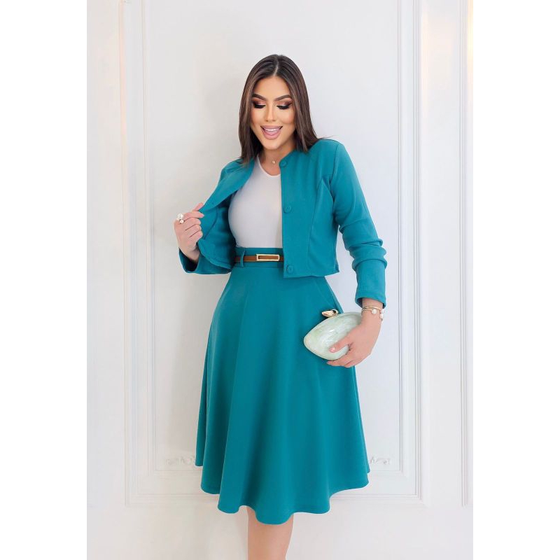 Conjunto Midi 4 Peças Feminino Evangélico Saia+Blazer+Camiseta+Cinto com botões | Moda Evangélica de Luxo