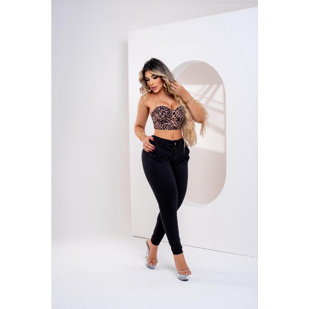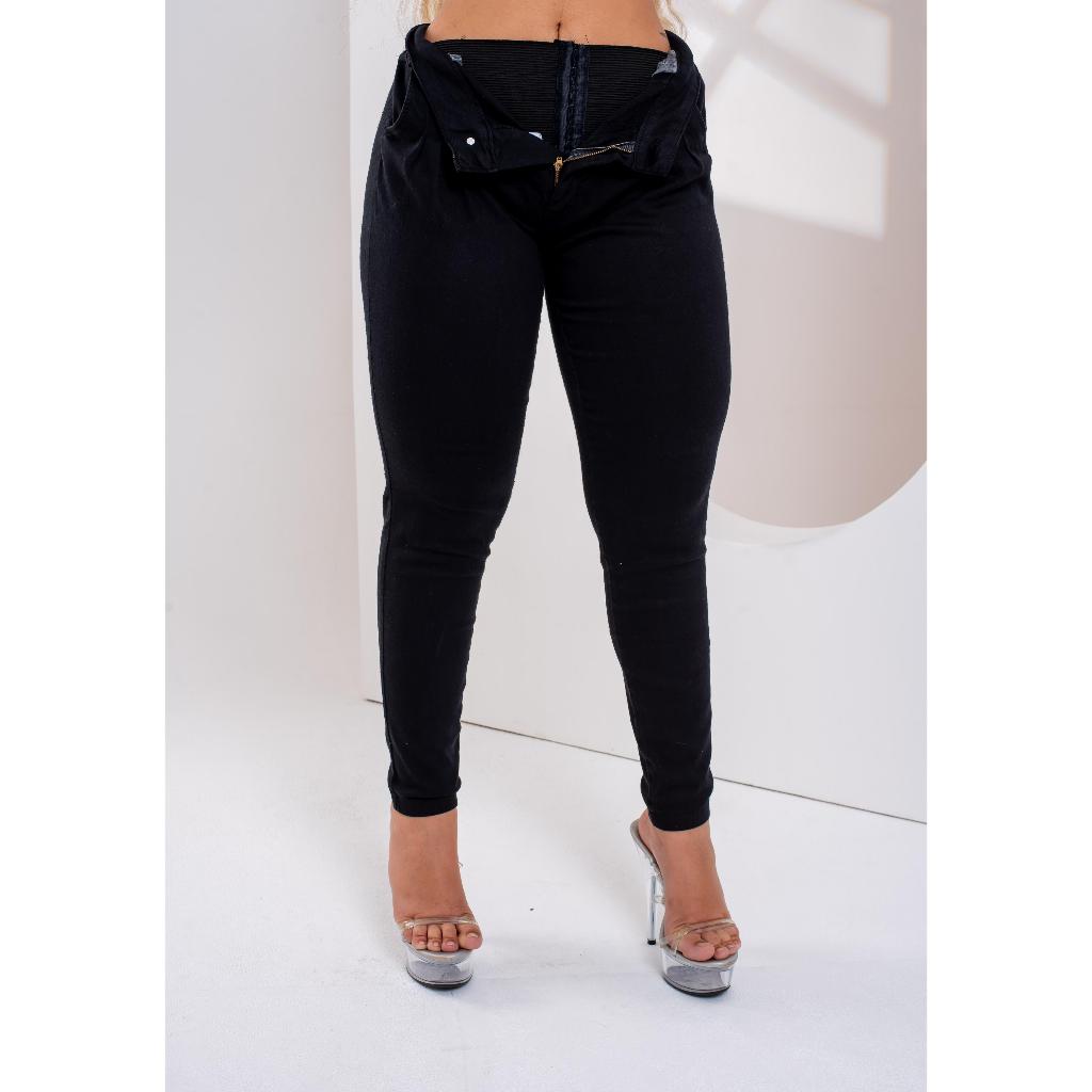 Calça Jeans Preta Feminino Com Lycra, Cintura Alta, Detalhes De Cinta Super Lipo modeladora, RVT.