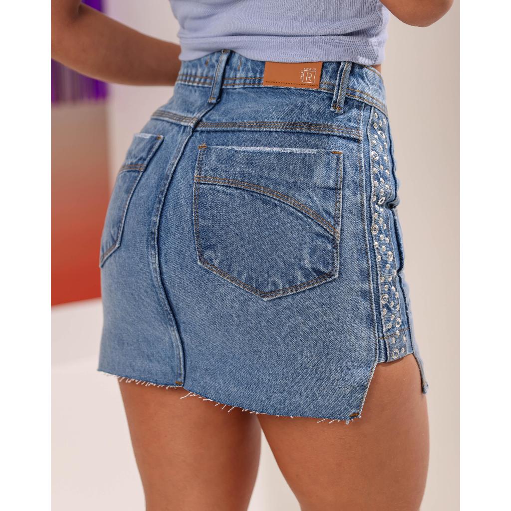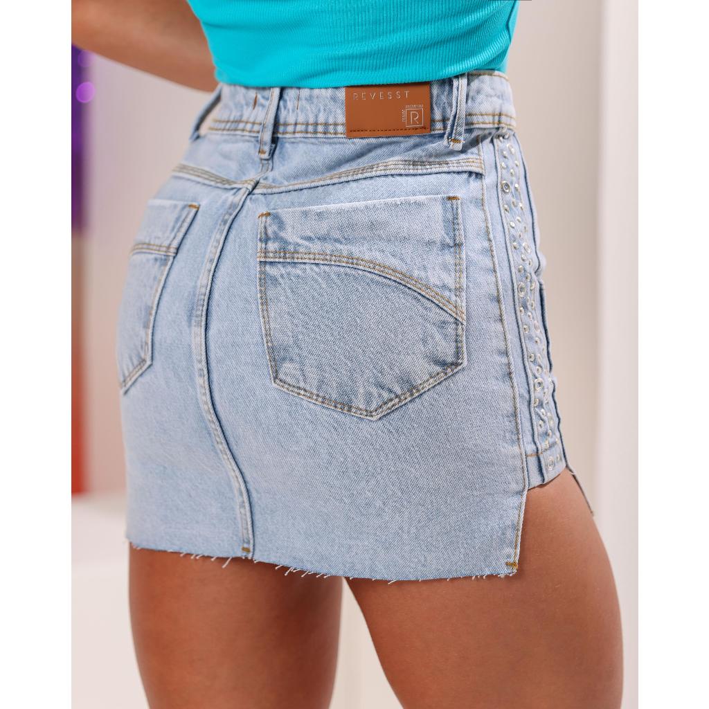 Saia Jeans Feminino Sem Lycra, Cintura Alta Detalhe De Brilho Lateral, RVT