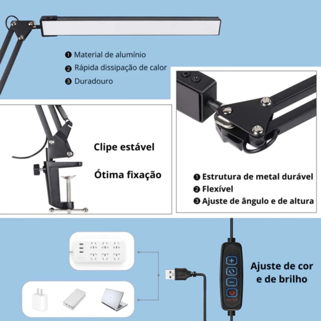 Luminária Articulada Dapon M18 Com Base Fixa e Garra - Usb e luz de Led