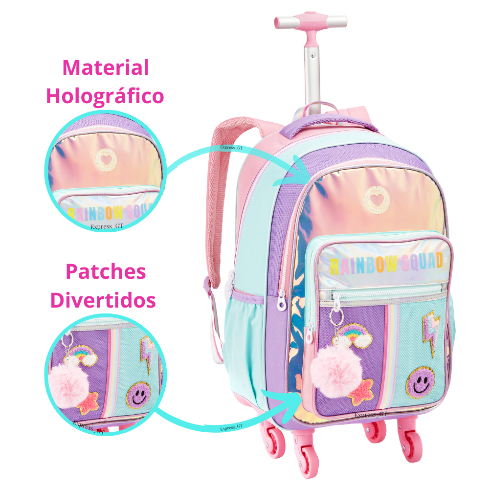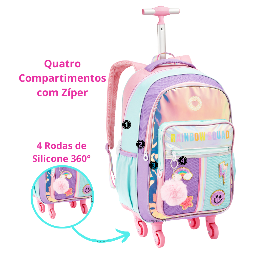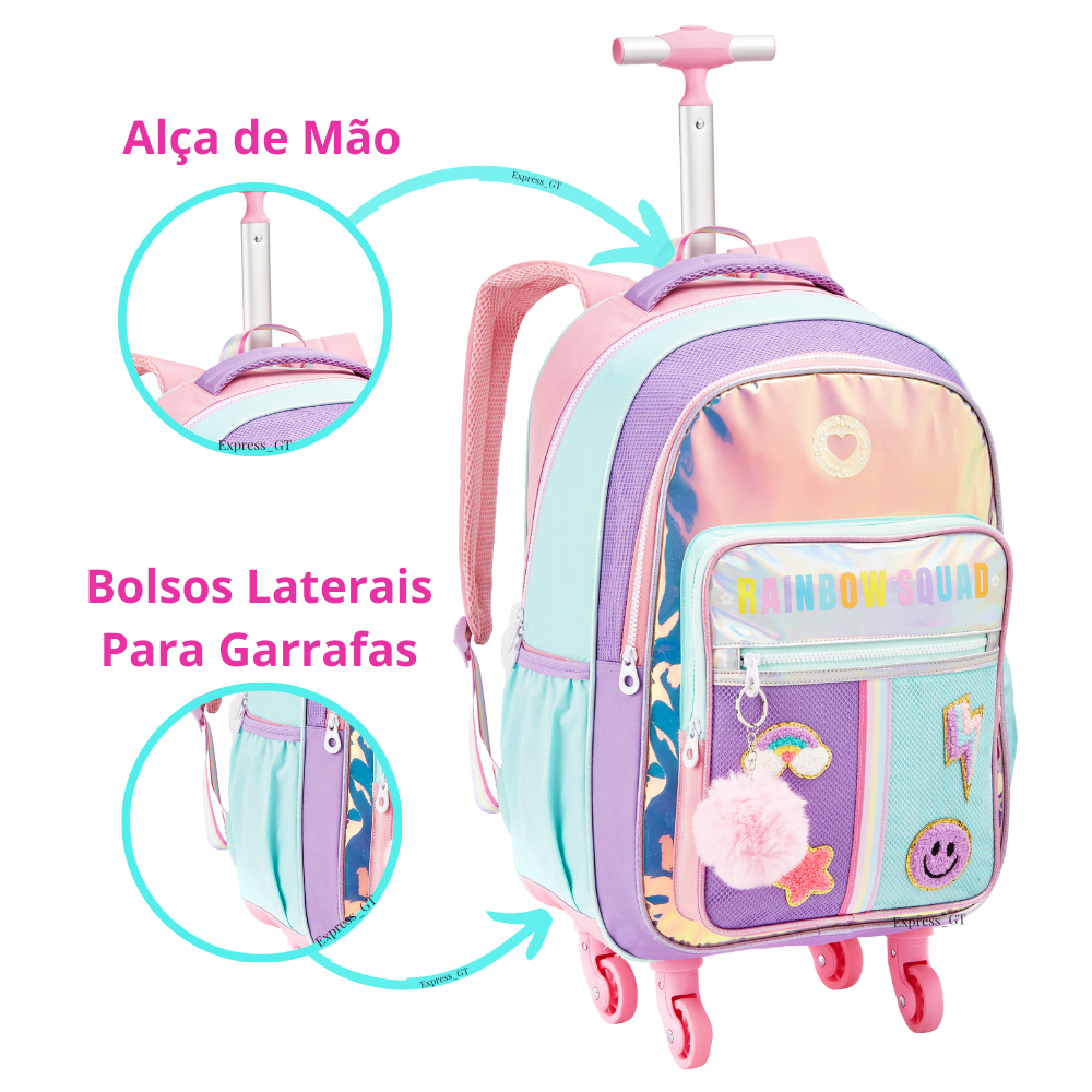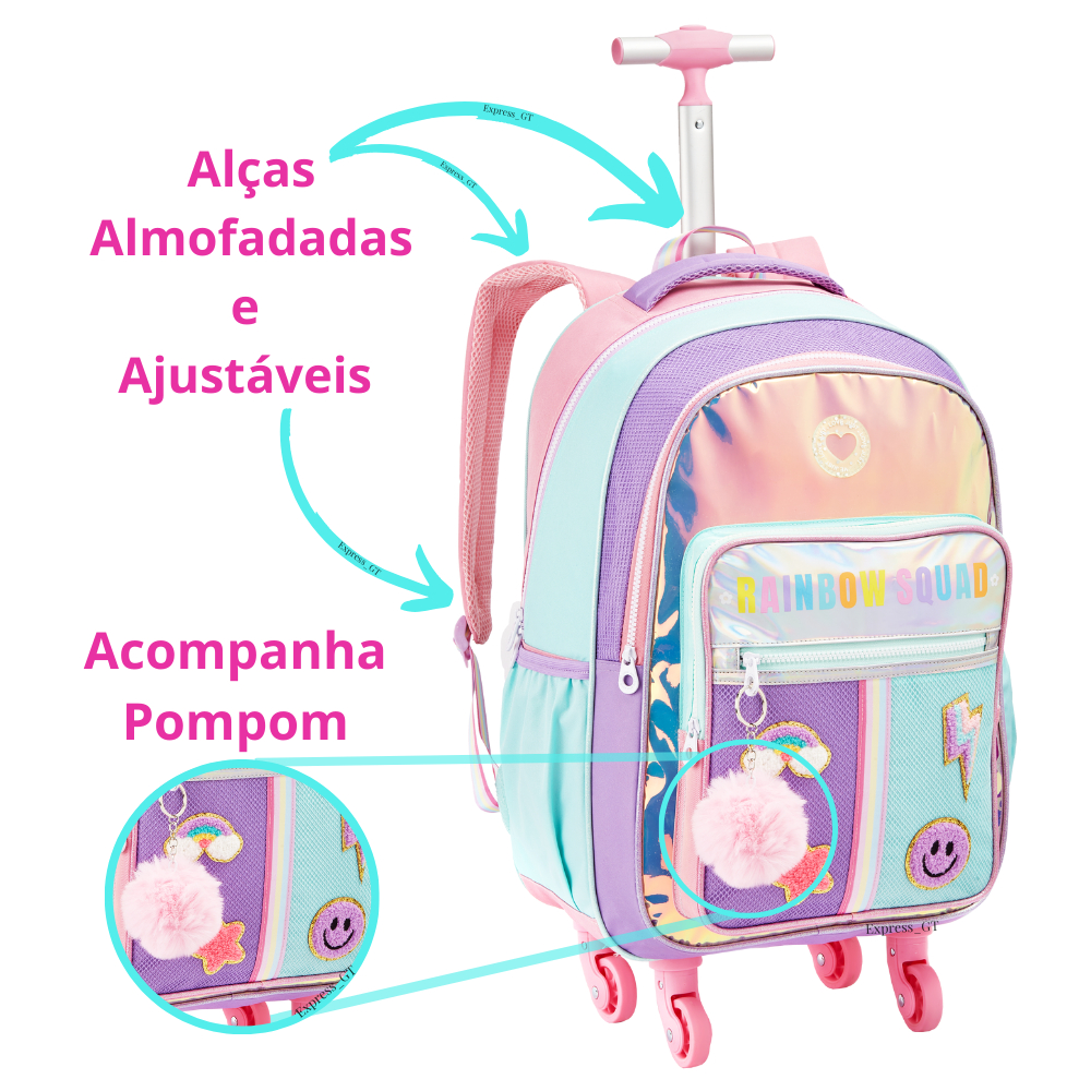 Mochila Infantil Menina Rodinha 360 Escolar Rainbow Holográfica Com PomPom Kit Bolsa Feminina Com Lancheira e Estojo