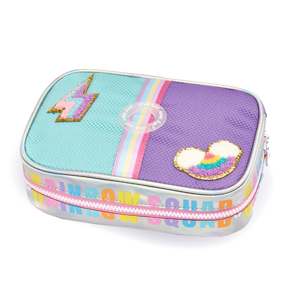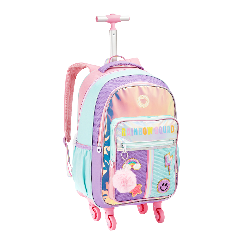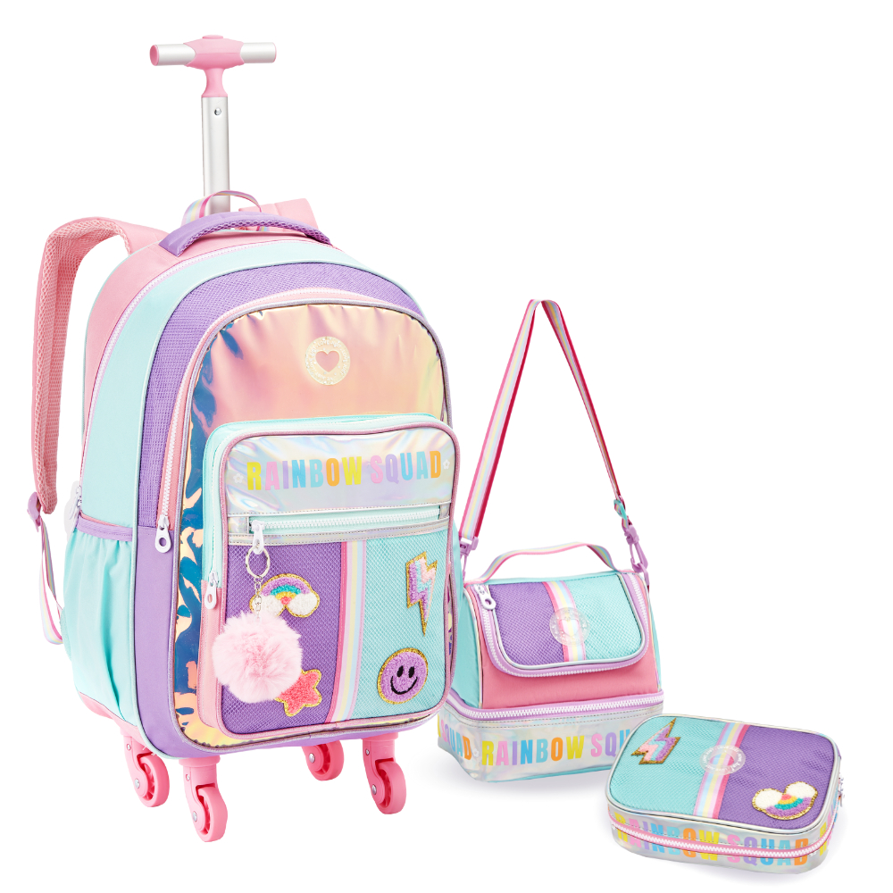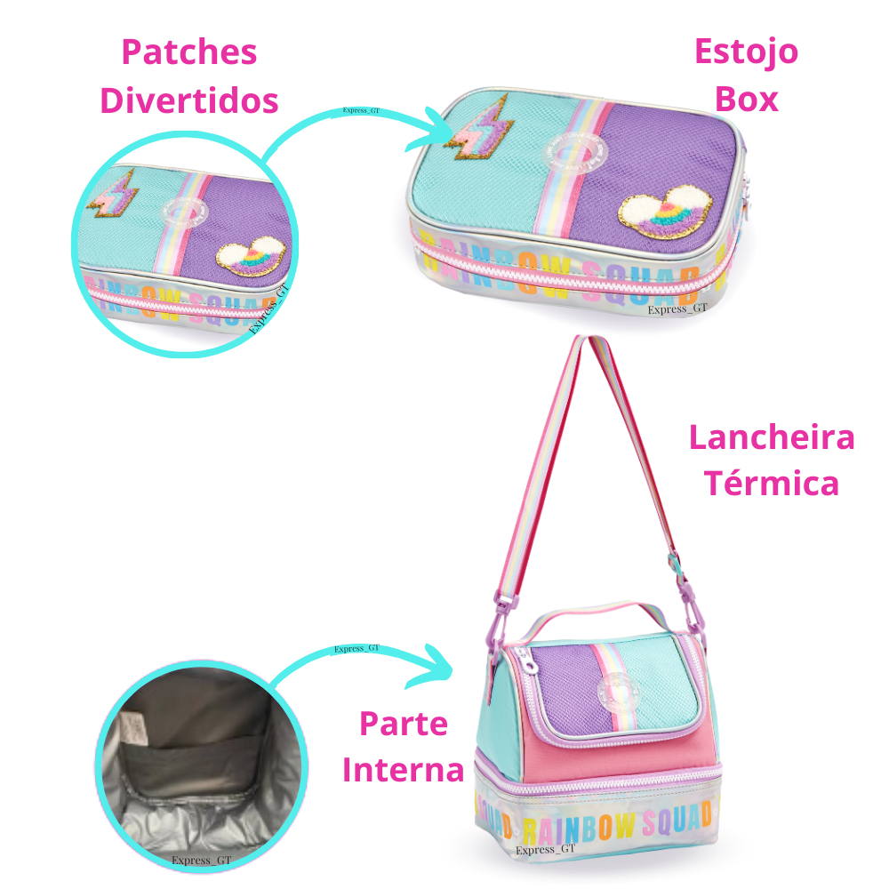 Mochila Infantil Menina Rodinha 360 Escolar Rainbow Holográfica Com PomPom Kit Bolsa Feminina Com Lancheira e Estojo