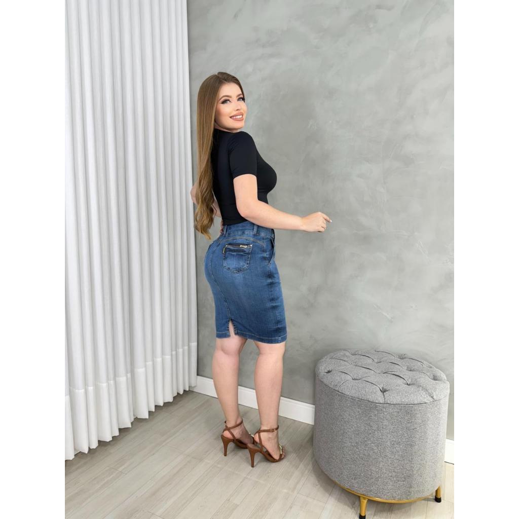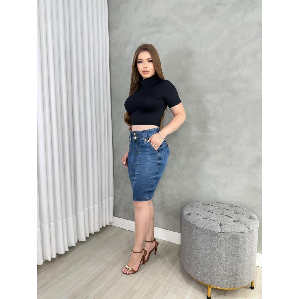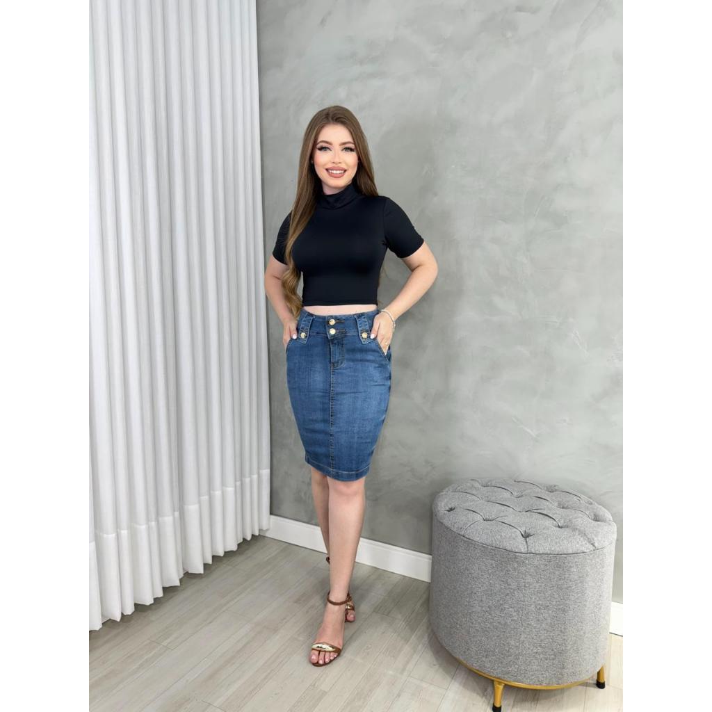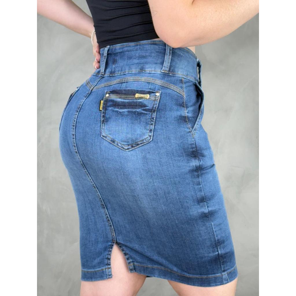 Saia Jeans Lapela Botões Mídi Cintura Alta Evangélica Com Elastano