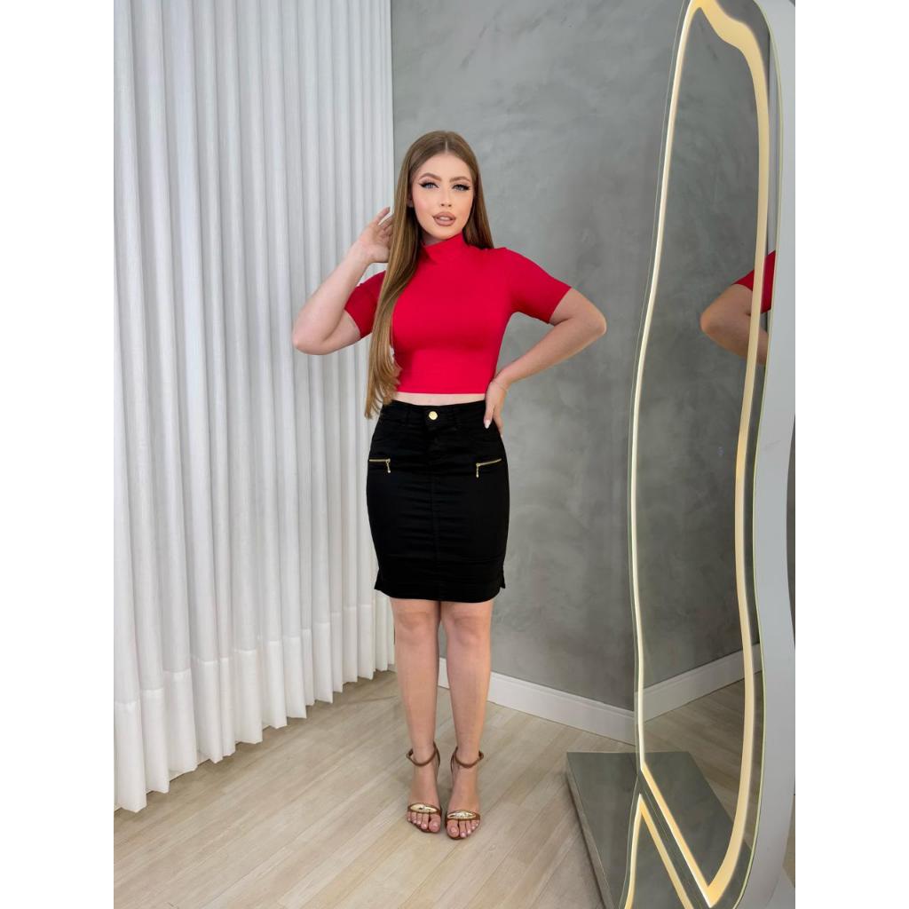 Saia Jeans Zíper Lateral Mídi Cintura Alta Evangélica com Elastano