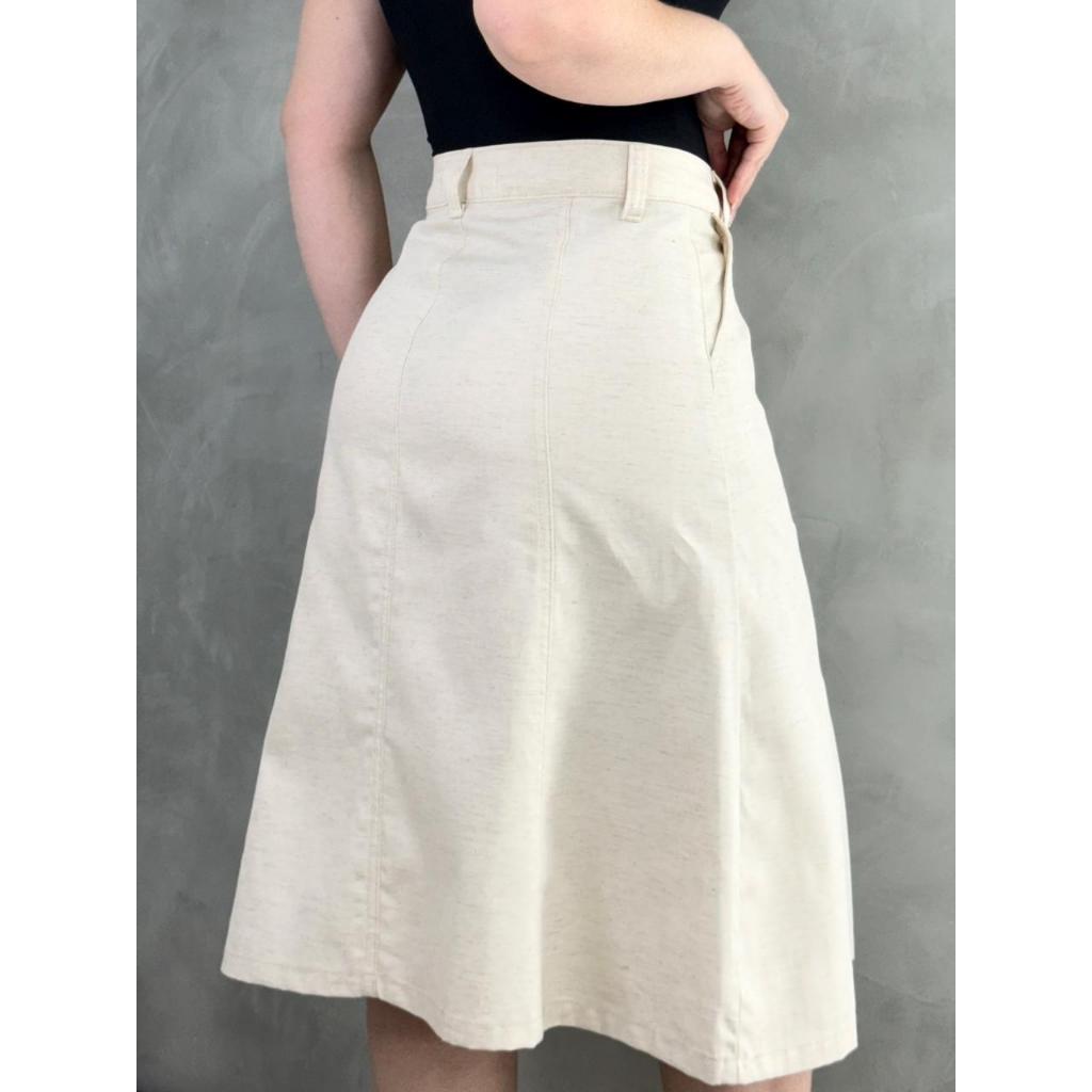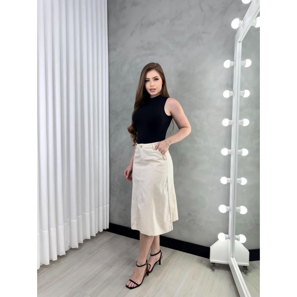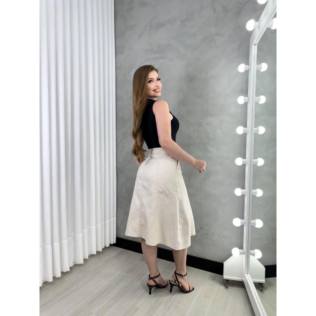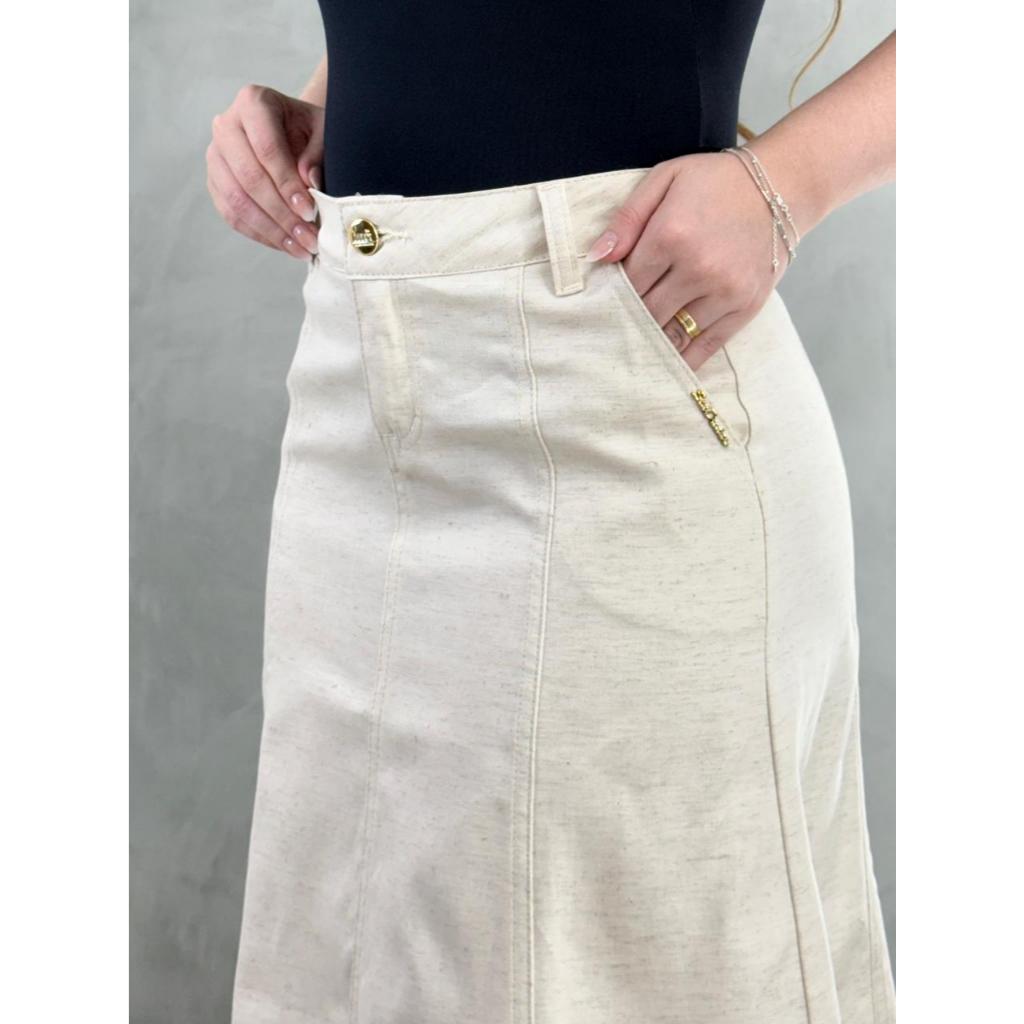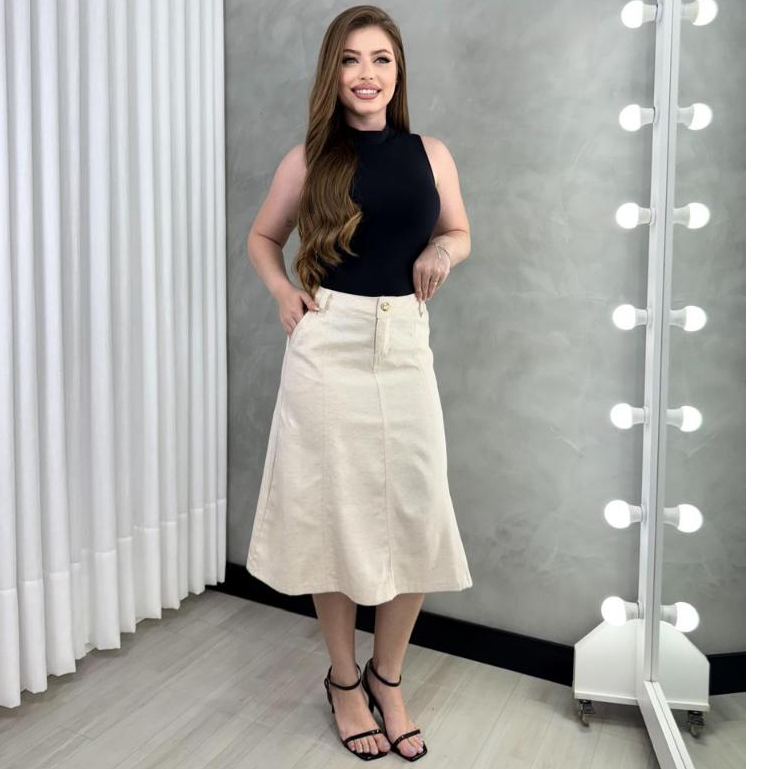 Saia Linho Alfaiataria Evasê Mídi Cintura Alta Evangélica
