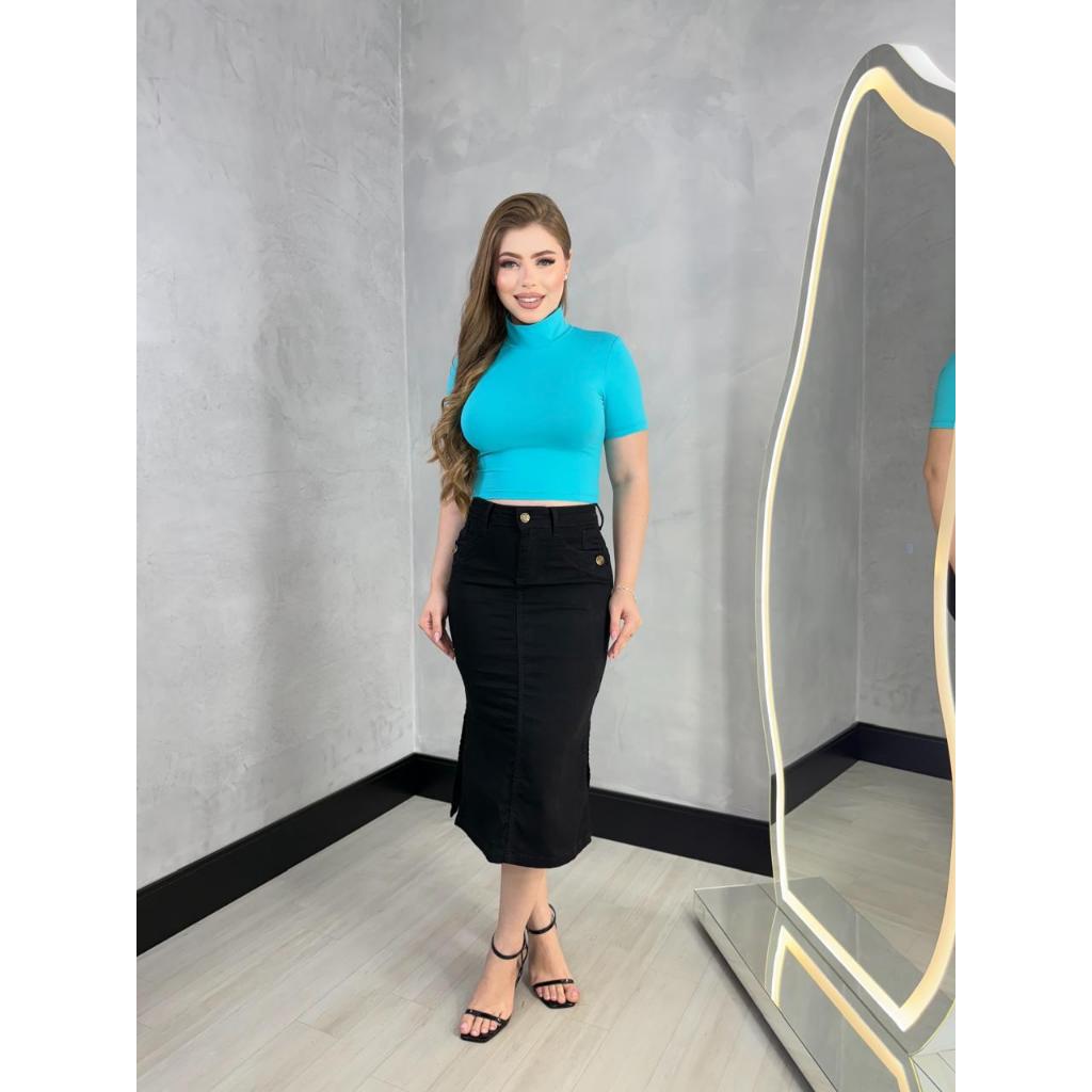 Saia Jeans Mídi Fenda Lateral Botão no Bolso Evangélica com Lycra Levanta Bumbum