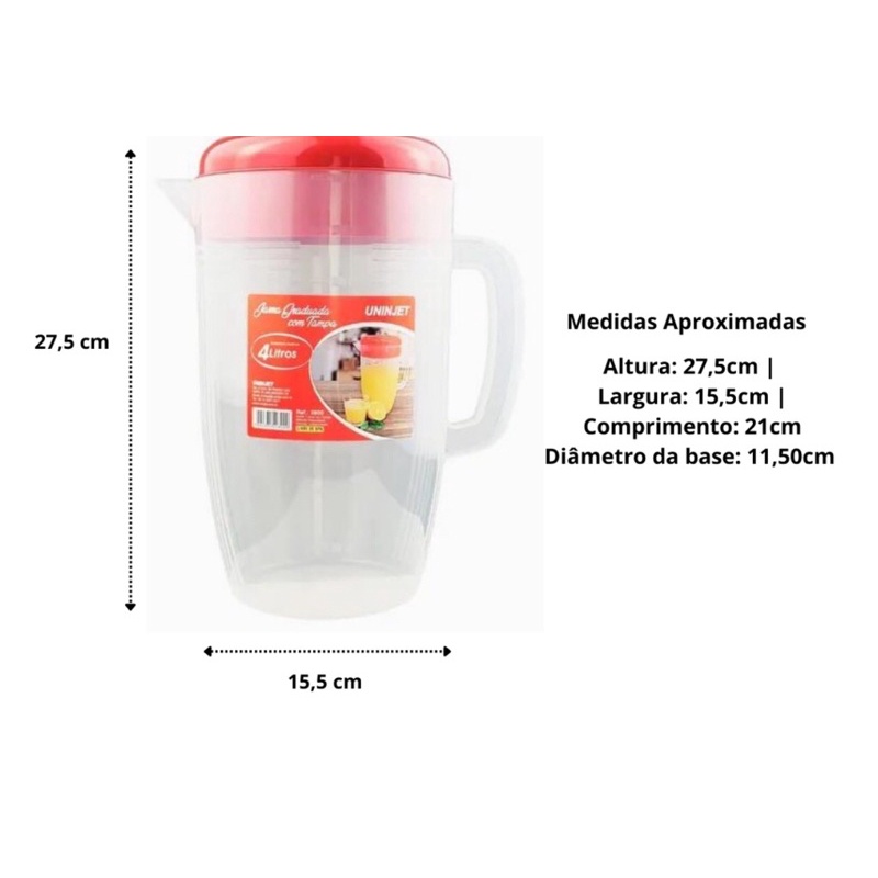 Jarra de Plástico 4 Litros Com Tampa Vermelha Suco Água Grande Resistente Bar Restaurantes Cozinha