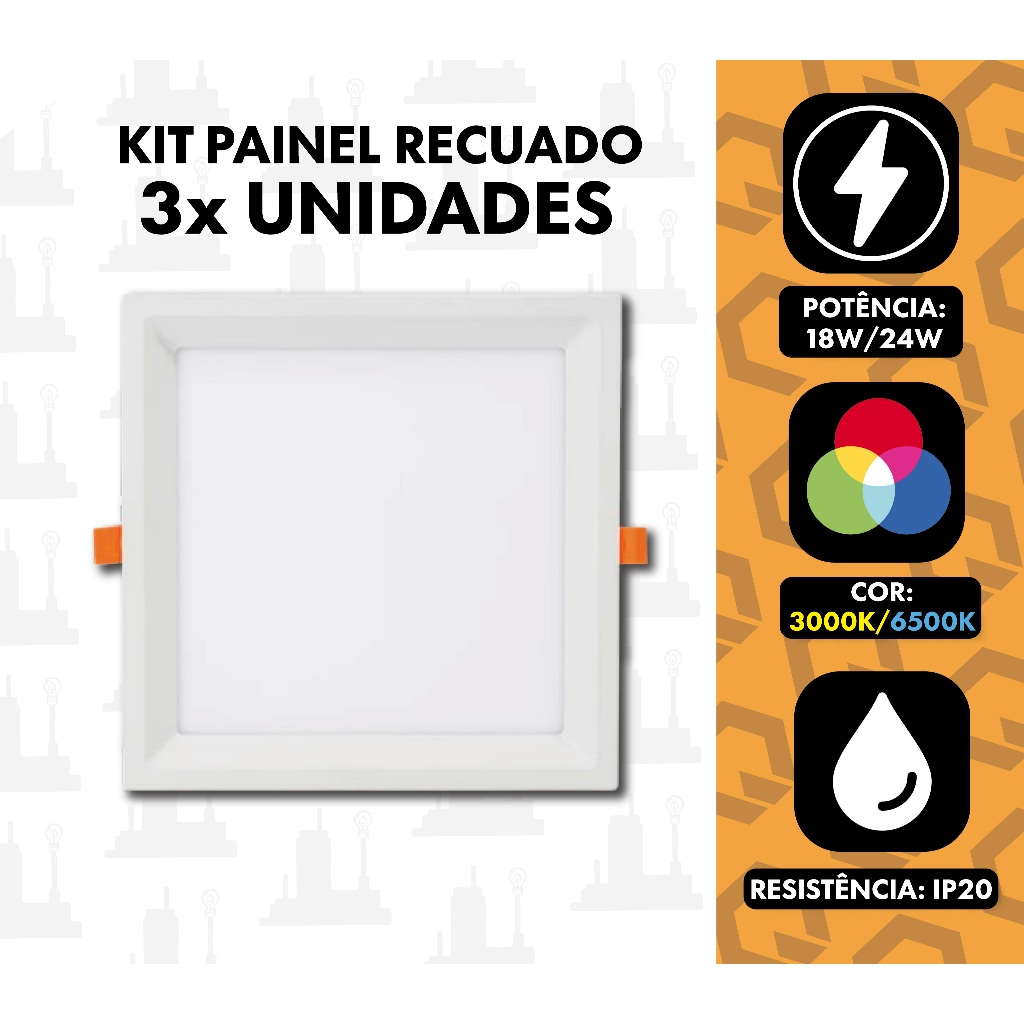 Kit 3 Luminaria Painel Led Recuado 18w/24w 22cm Embutir Quadrado 3000k 6500K Bivolt