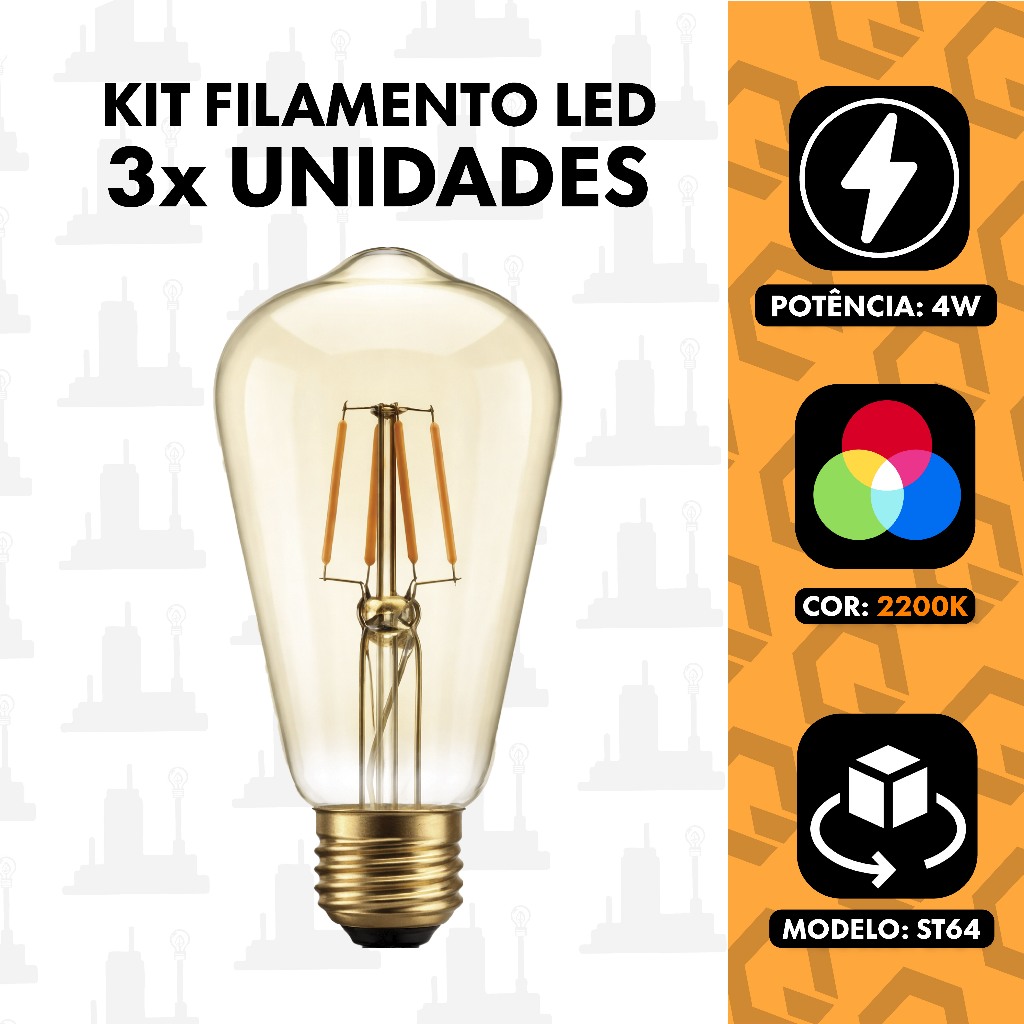 Kit 3 Filamento led 4w st64 E27 2200k Bivolt lampada Vintage Retro