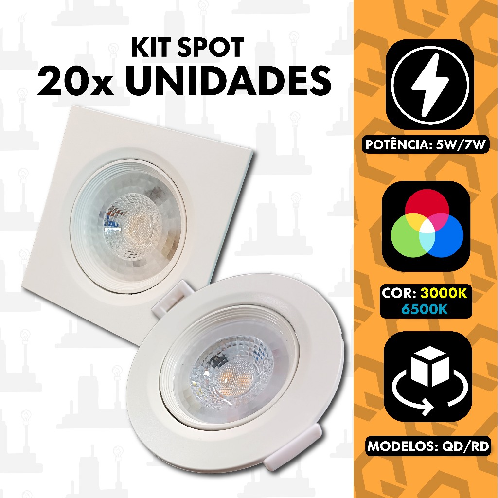 Kit 20 Spot led 5w 7w Luminária Bivolt Direcionavel Redondo/Quadrado Emb 6500k/ 3000k