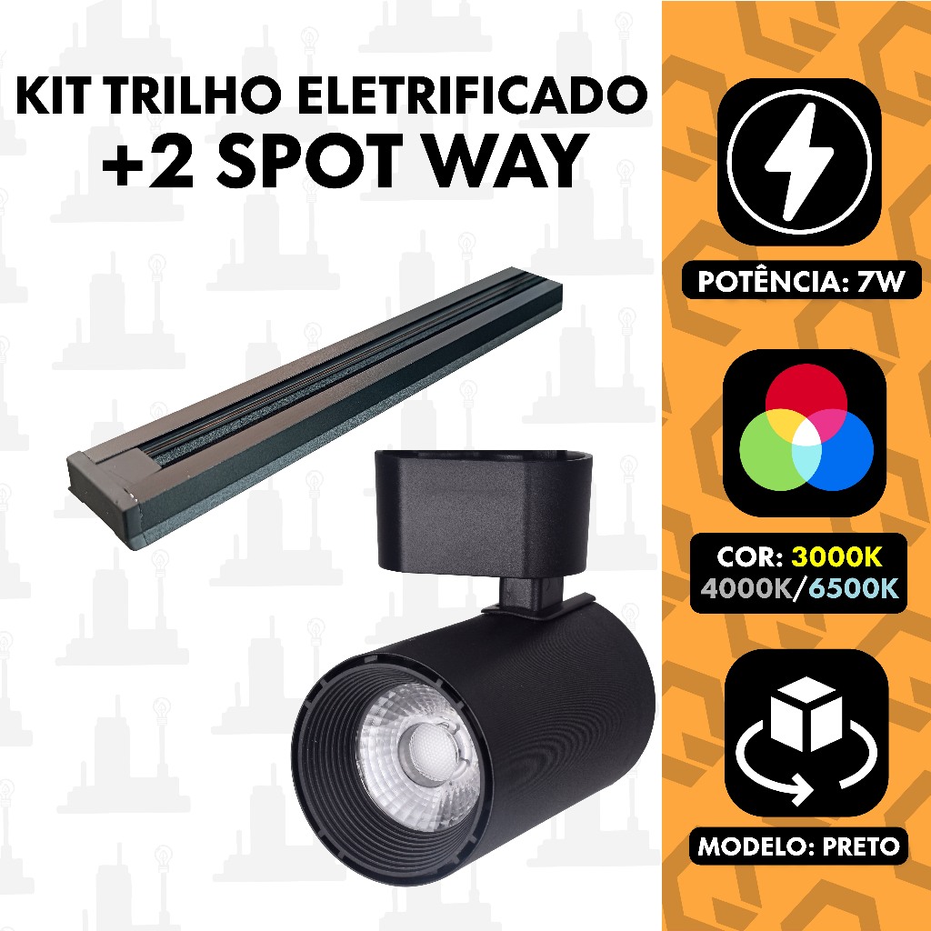 kit Trilho Eletrificado de 1m + 2 Spots 7w led Preto Luz Branco 6500k/ Neutro 4000k/ Amarelo 3000k