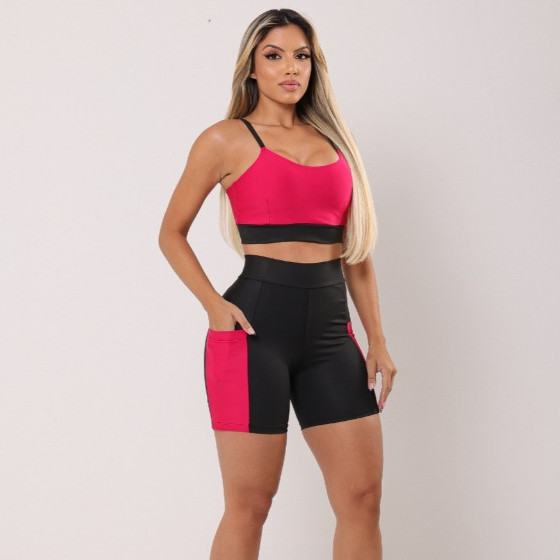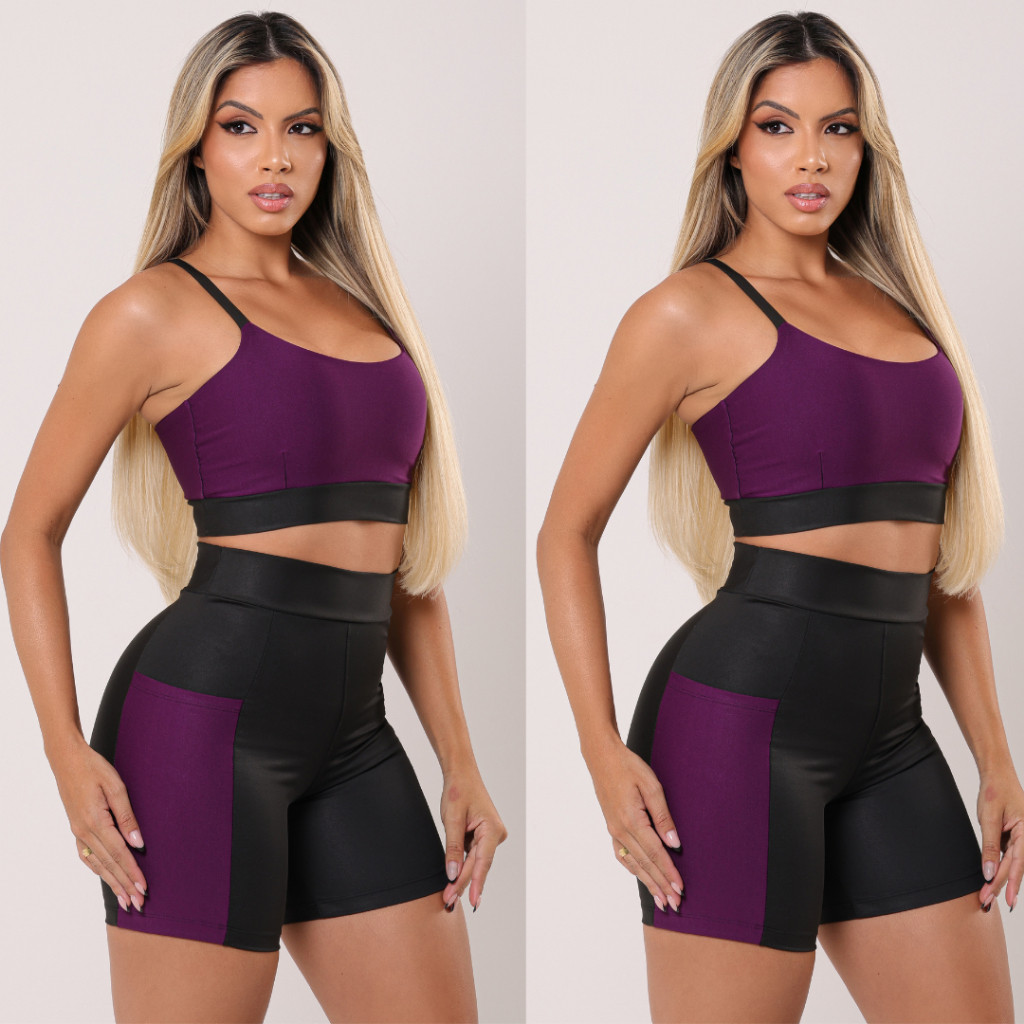 Kit 2 Conjunto Fitness Feminino Short e Top Com Bolso Lateral Academia