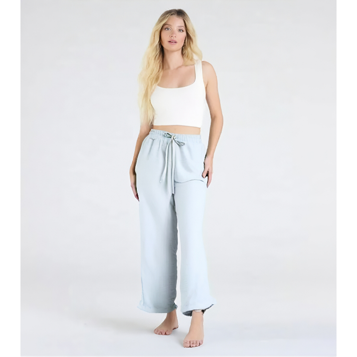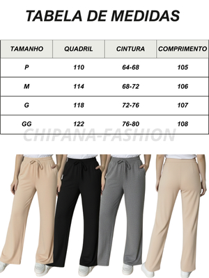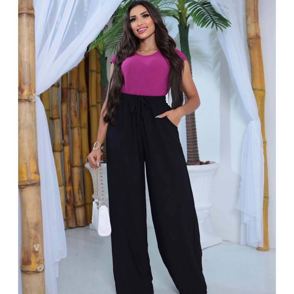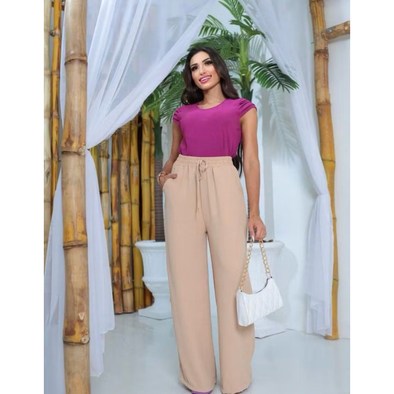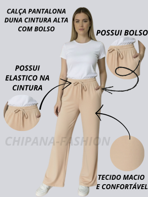 Calça Feminina Pantalona Tecido Duna Lisa Cintura Alta com Elastico Casual