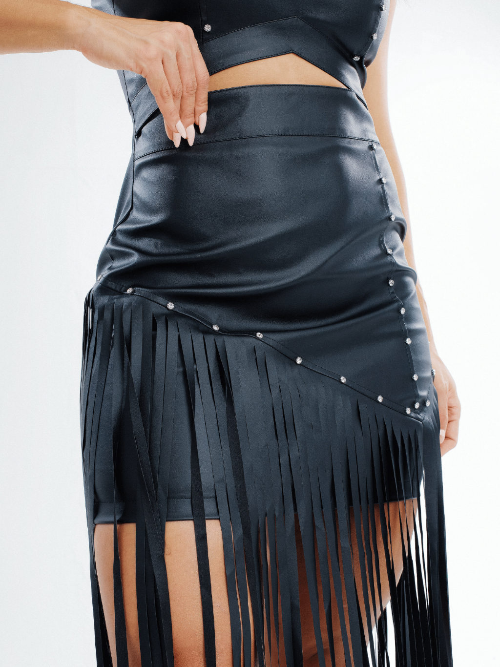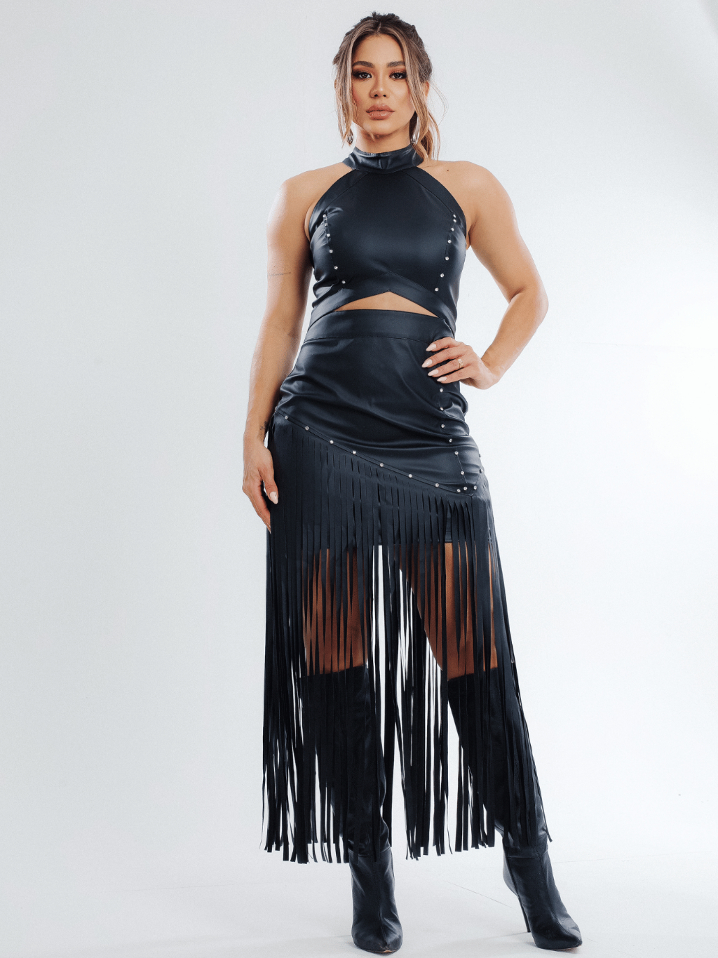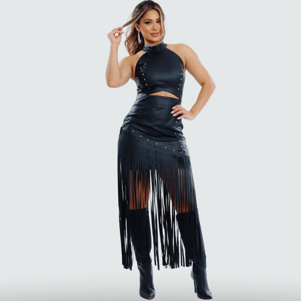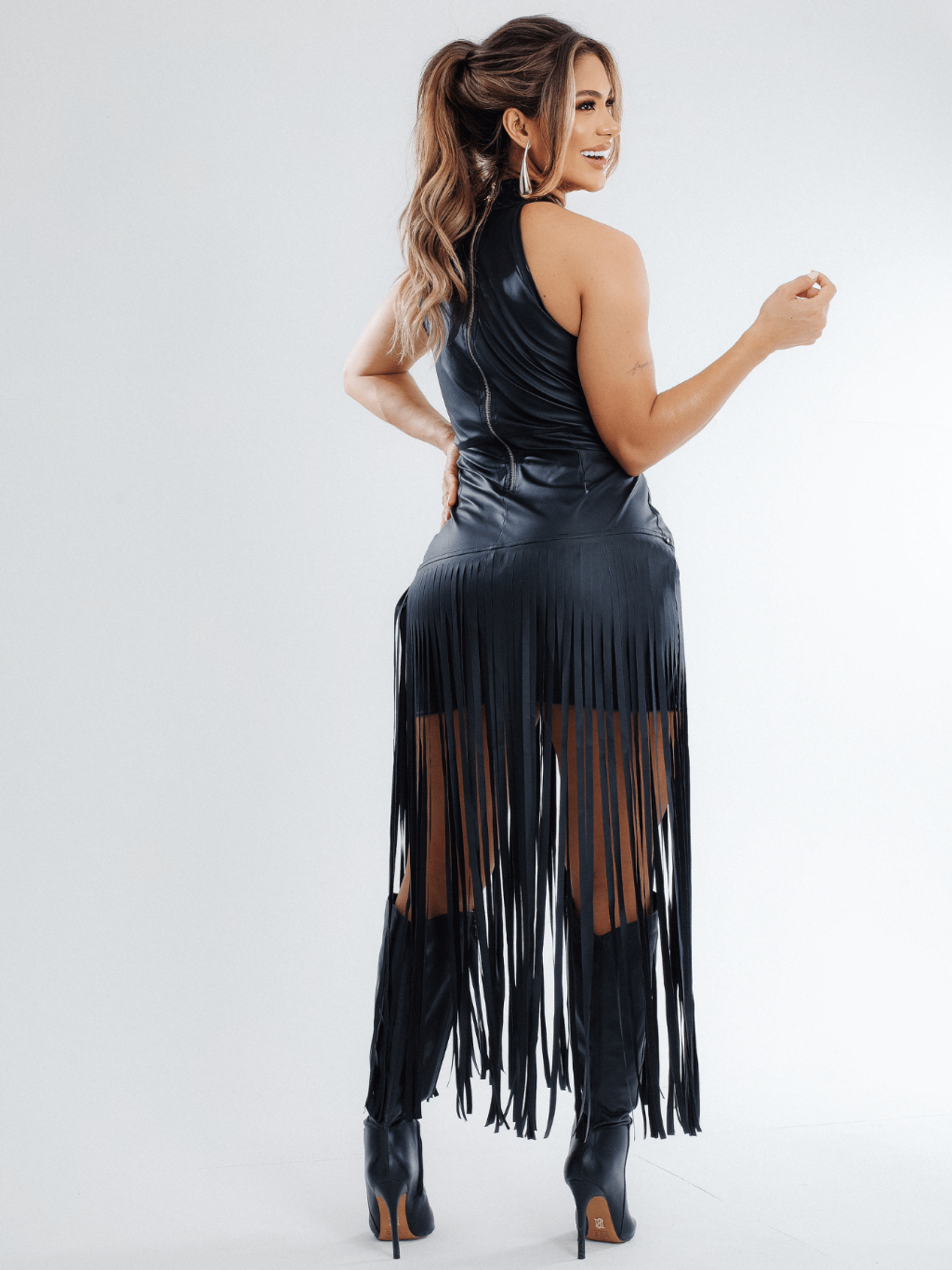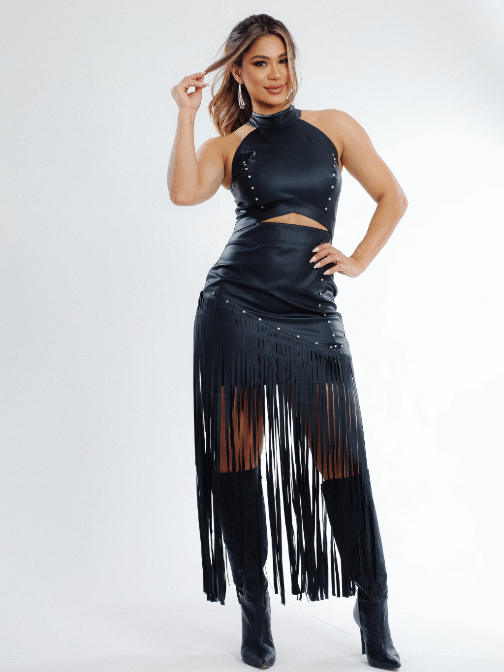 Vestido Couro Franjas Pedraria Gola Alta Diene