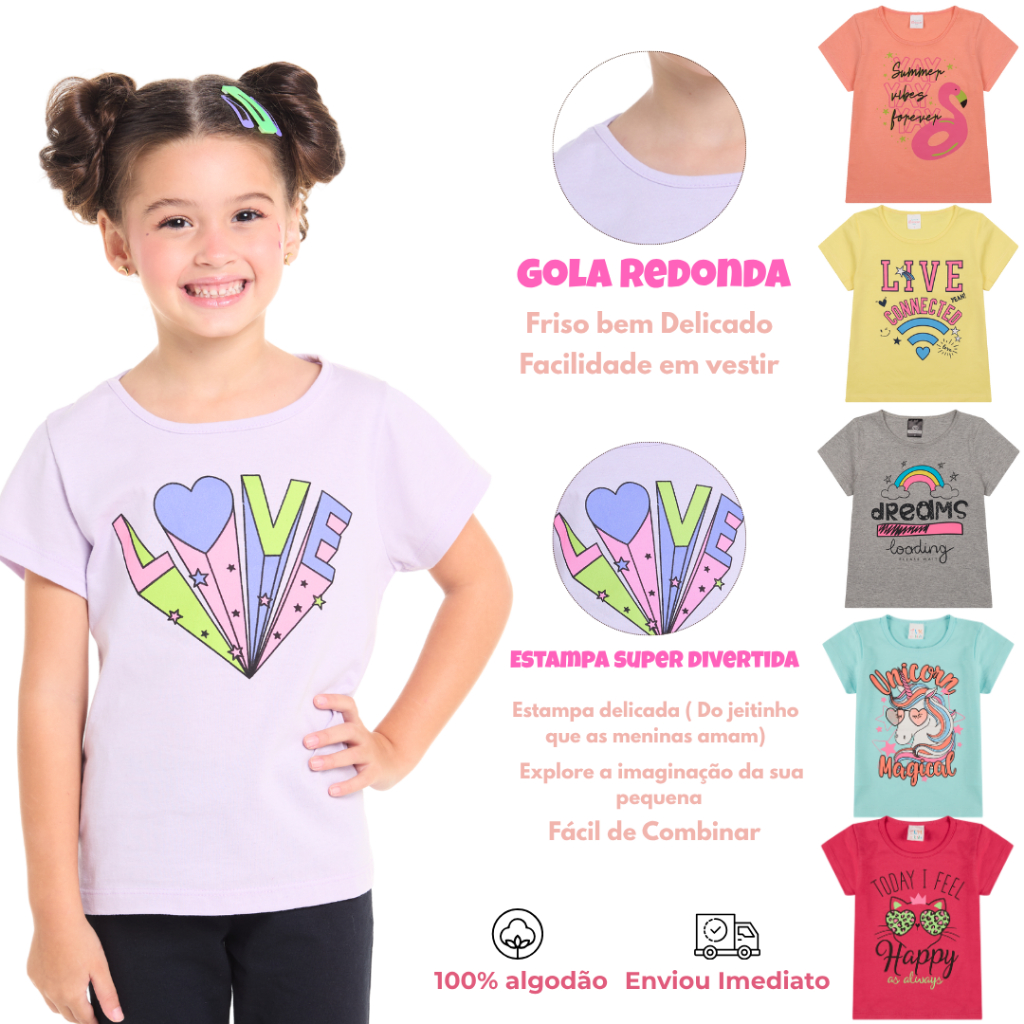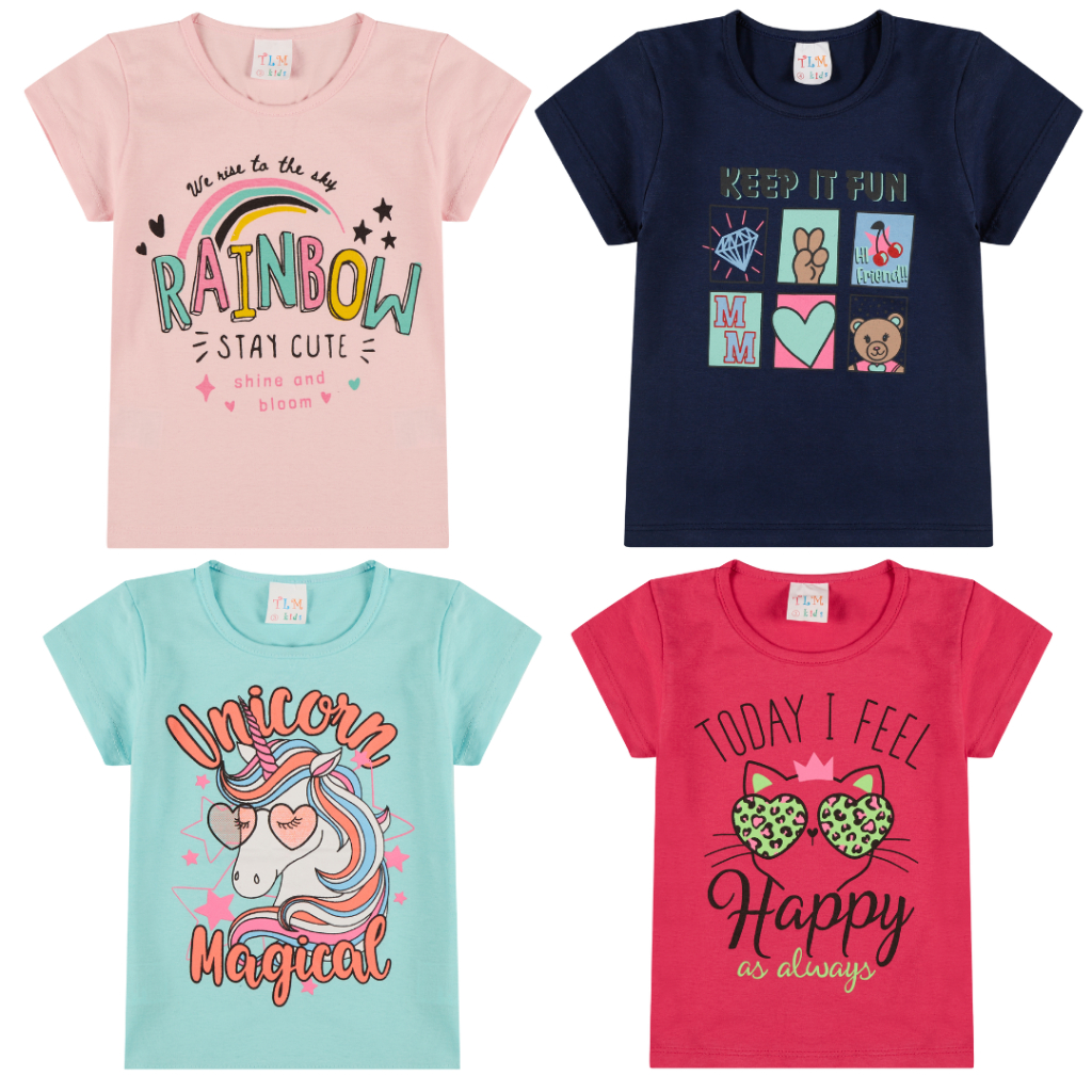 Kit 4 Camisetas Infantil Manga Curta em Meia Malha 100% Algodão 2 ao 8 anos