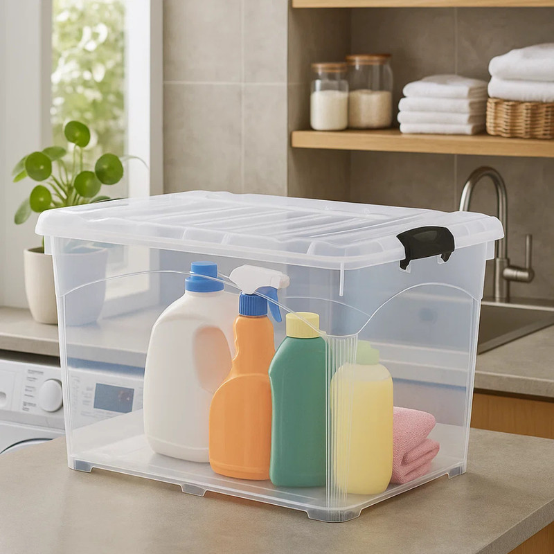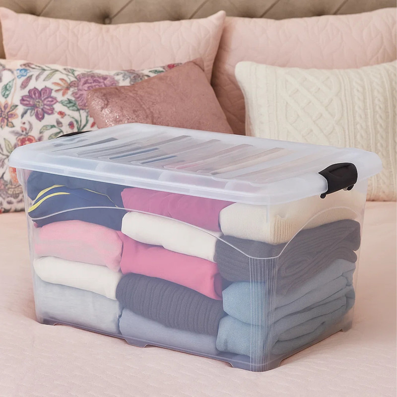 CAIXA CONTAINER ORGANIZADORA ATÉ 95 LITROS REFORÇADA EMPILHÁVEL TAMPA TRAVA TRANPARENTE MULTIUSO