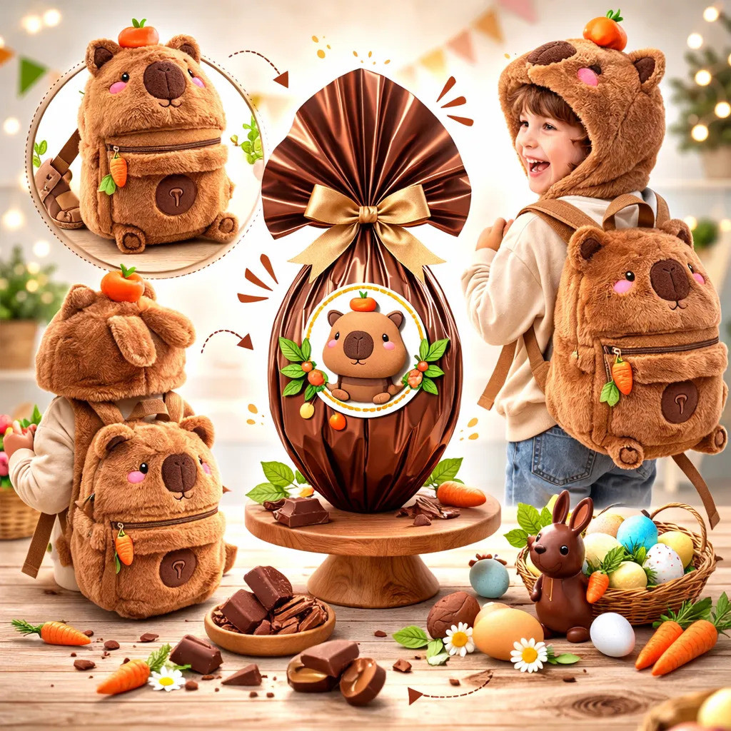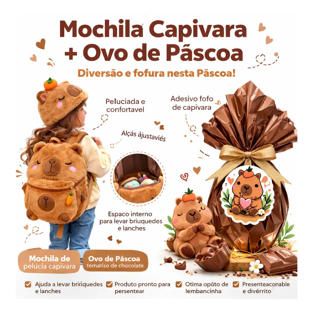 Kit Páscoa Infantil Mochila Capivara com Touca + Ovo Temático – Presente Fofo Meninos e Meninas