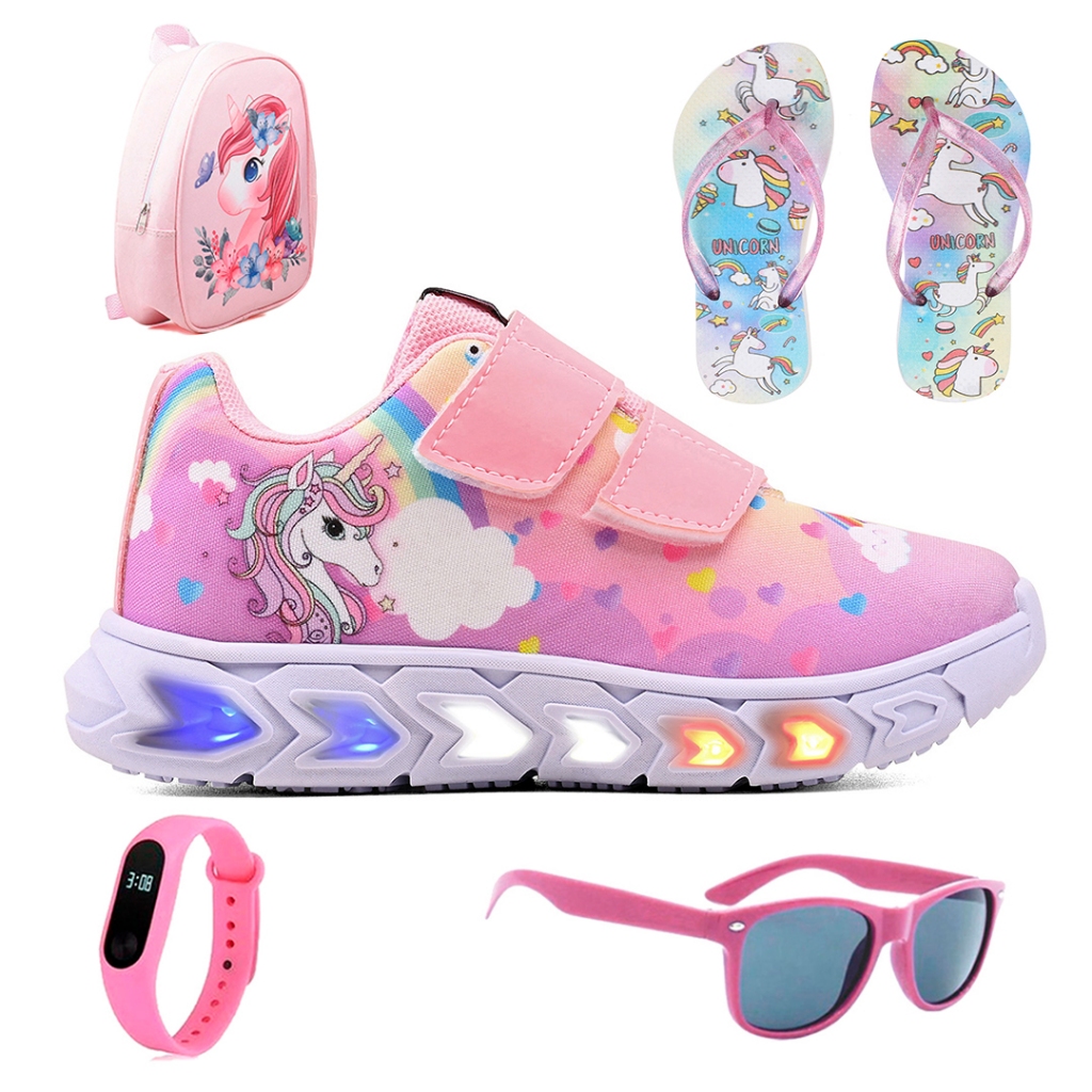 Tenis Infantil De Led Unicornio Meninas Casual + Mochila + Chinelo + Oculos + Relogio