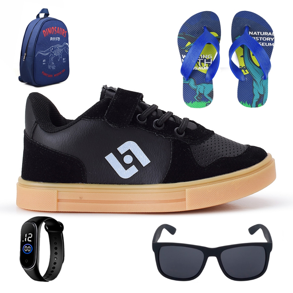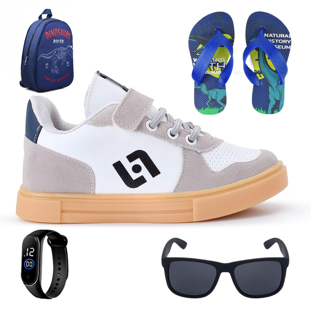 Tenis Infantil Casual Sapatenis Meninos Street Calce Facil + Mochila + Chinelo + Oculos + Relogio