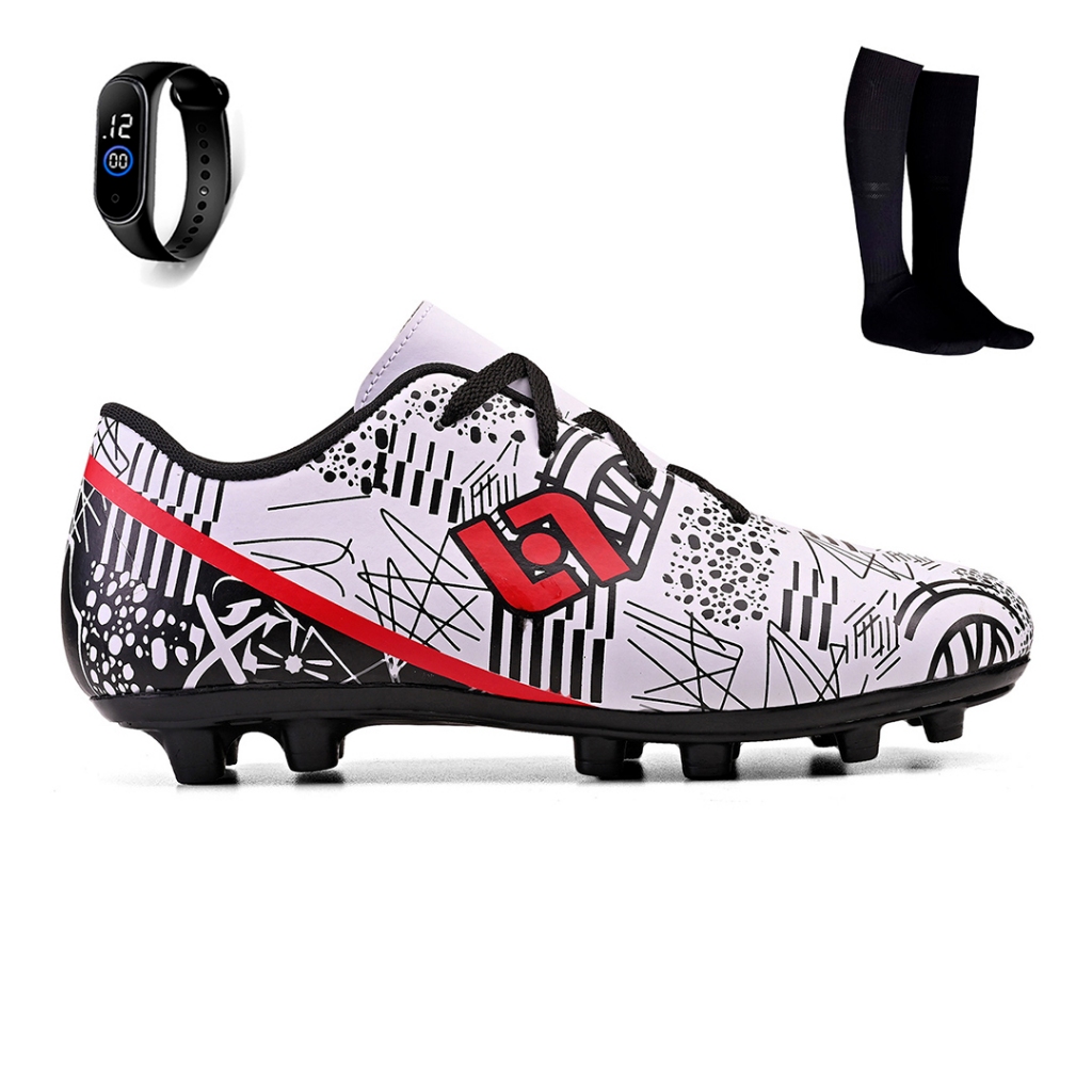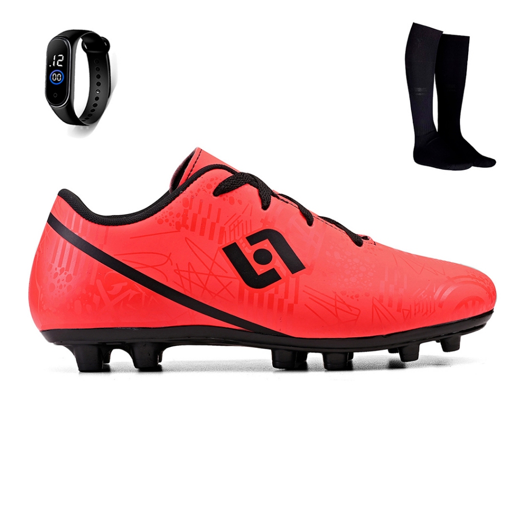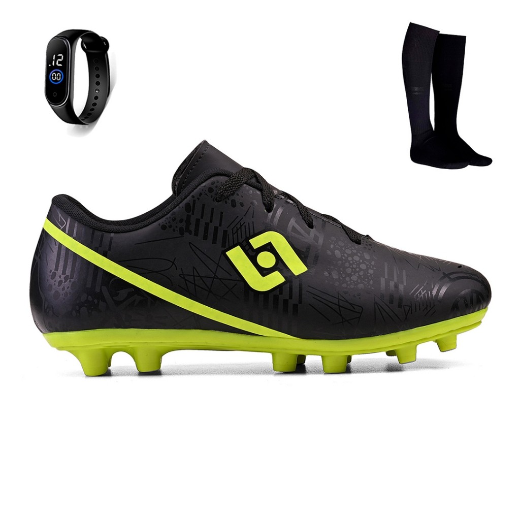 Kit Chuteira Infantil Costurada Futebol Campo Trava Light + Meiao e Relogio