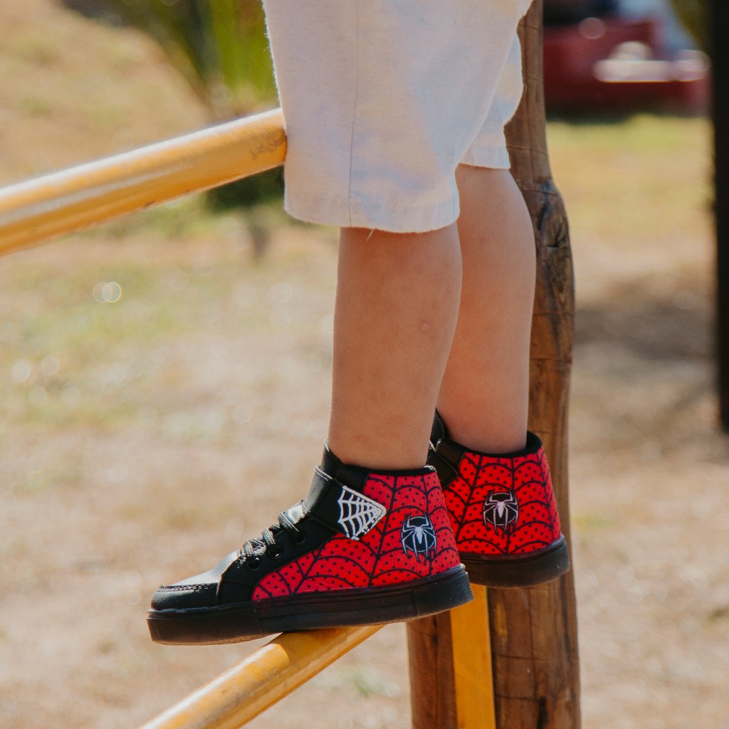 Kit Tenis Botinha de Led Meninos Cano Alto Aranha Ajuste Facil + Mochila Chinelo Oculos e Relogio