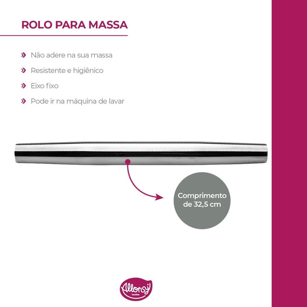 Rolo para abrir massas de Confeitaria Panificação manual Moderno Aço Inox 32,5cm Prata