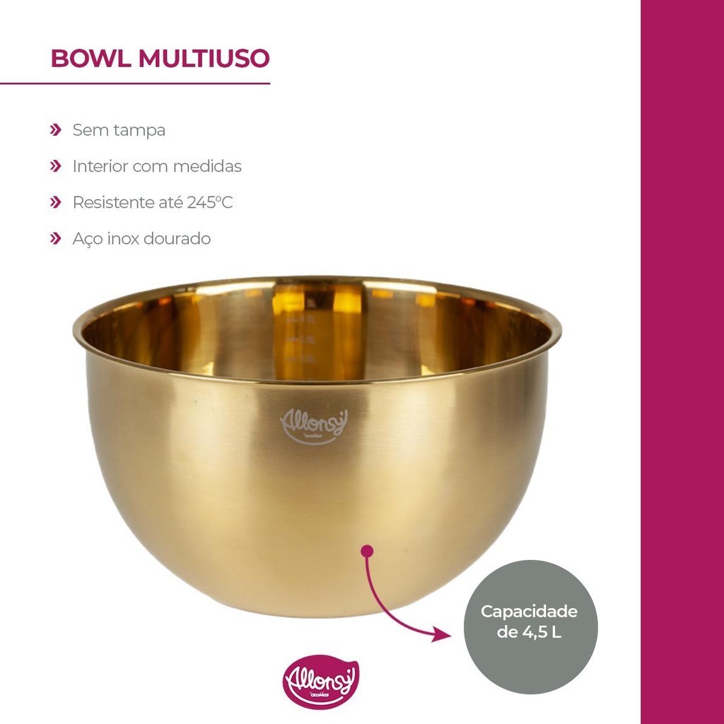 Bowl Tigela de cozinha Multiuso de Inox 4,5L com medidas Dourado Preparar Armazenar Servir