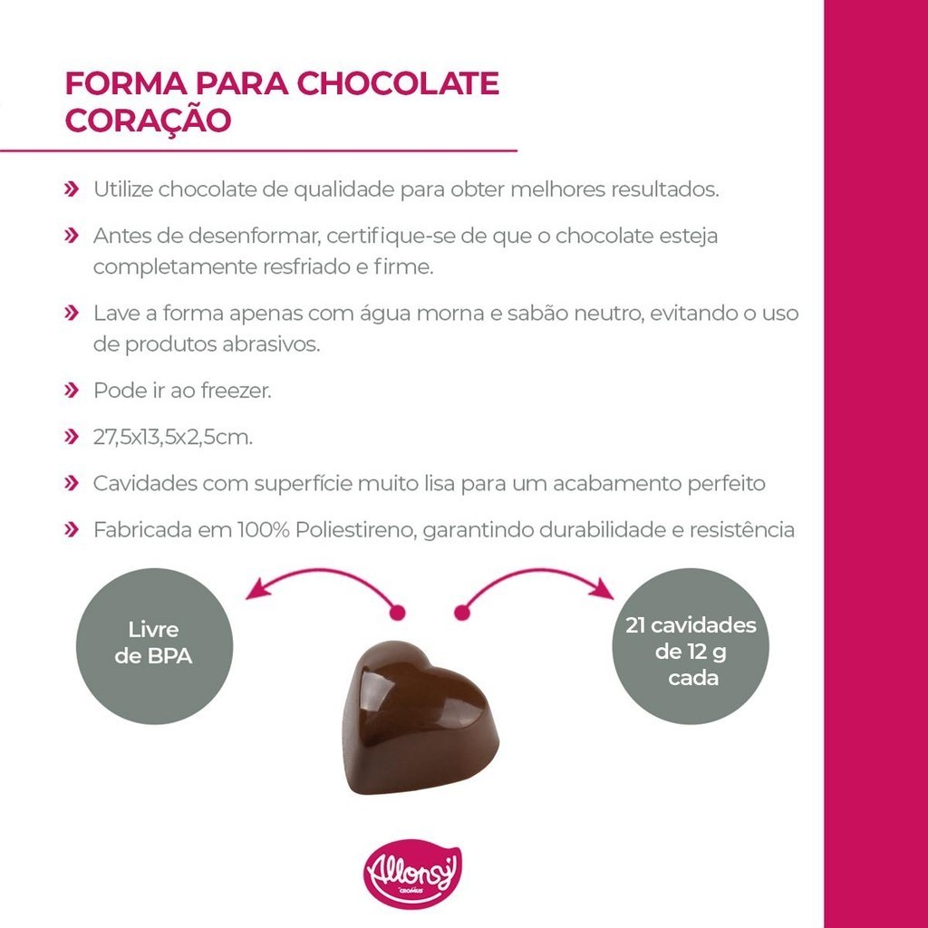 Molde 21 Cavidades Forma de Coração para Bombons Chocolates e Trufas 27,5x13,5x2,5cm Cromus Allonsy