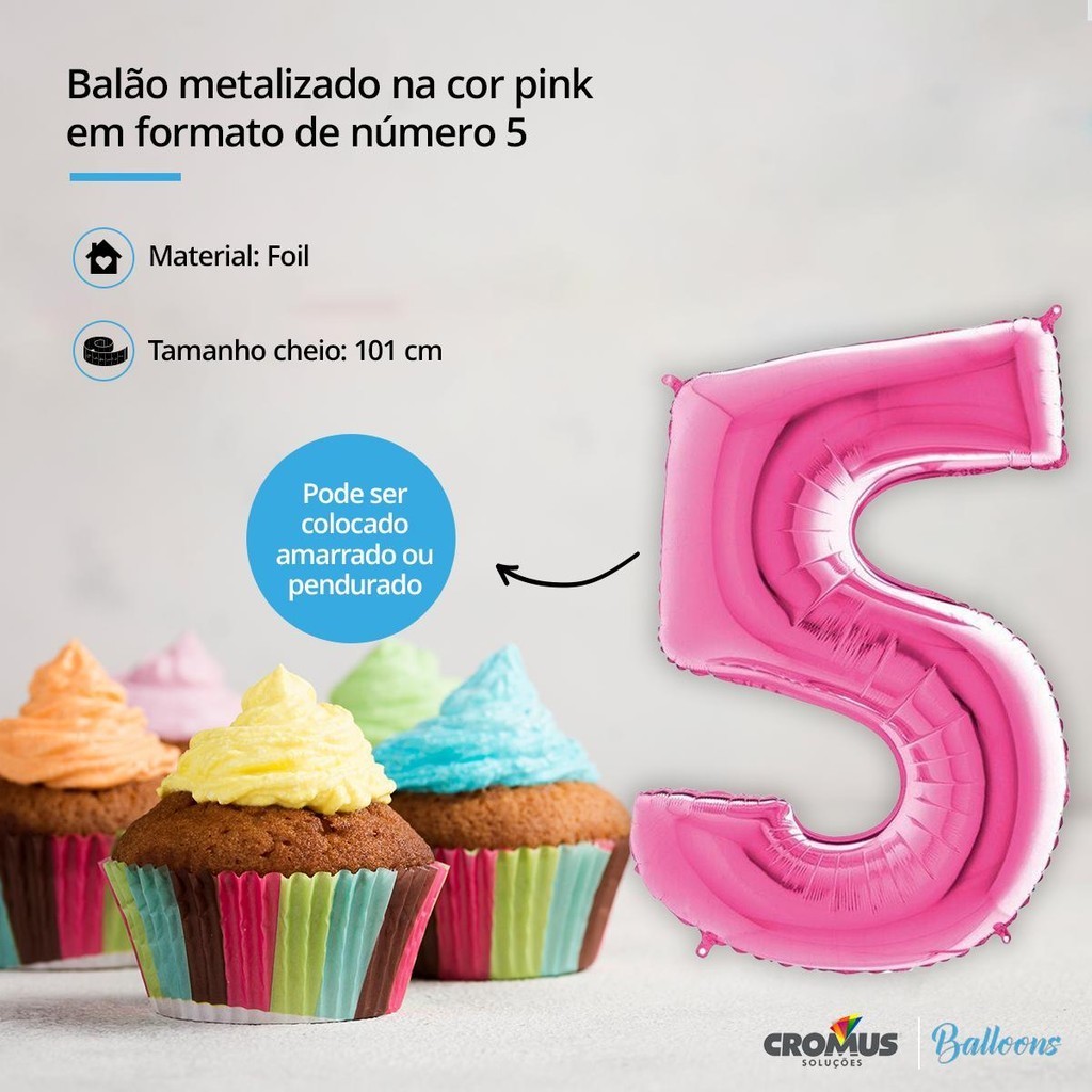 Balão Metalizado Pink número 5 Rosa choque para festas e eventos 101 cm unidade