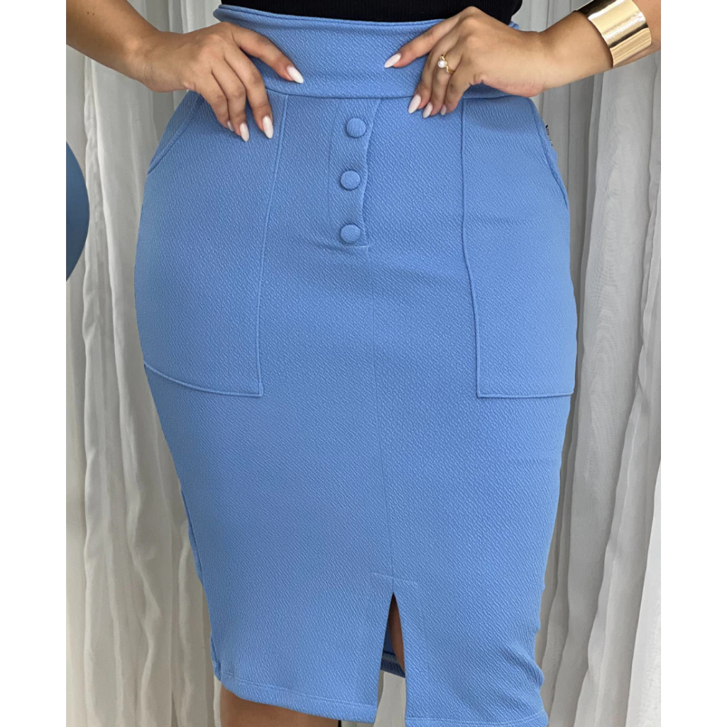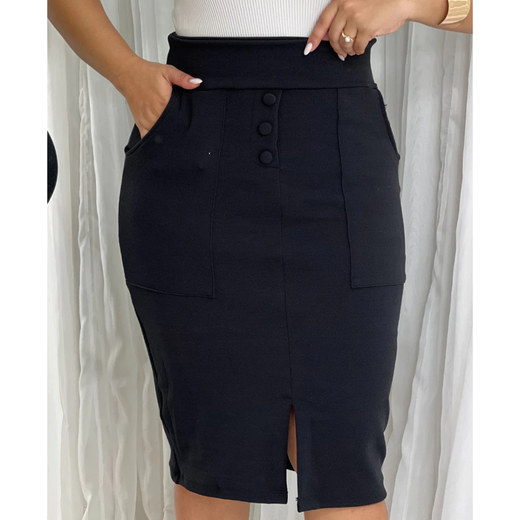 Saia Feminina Com Fenda Bolso Com Botão Fake Saia Social Midi Feminina Patê Falso Moda Feminina