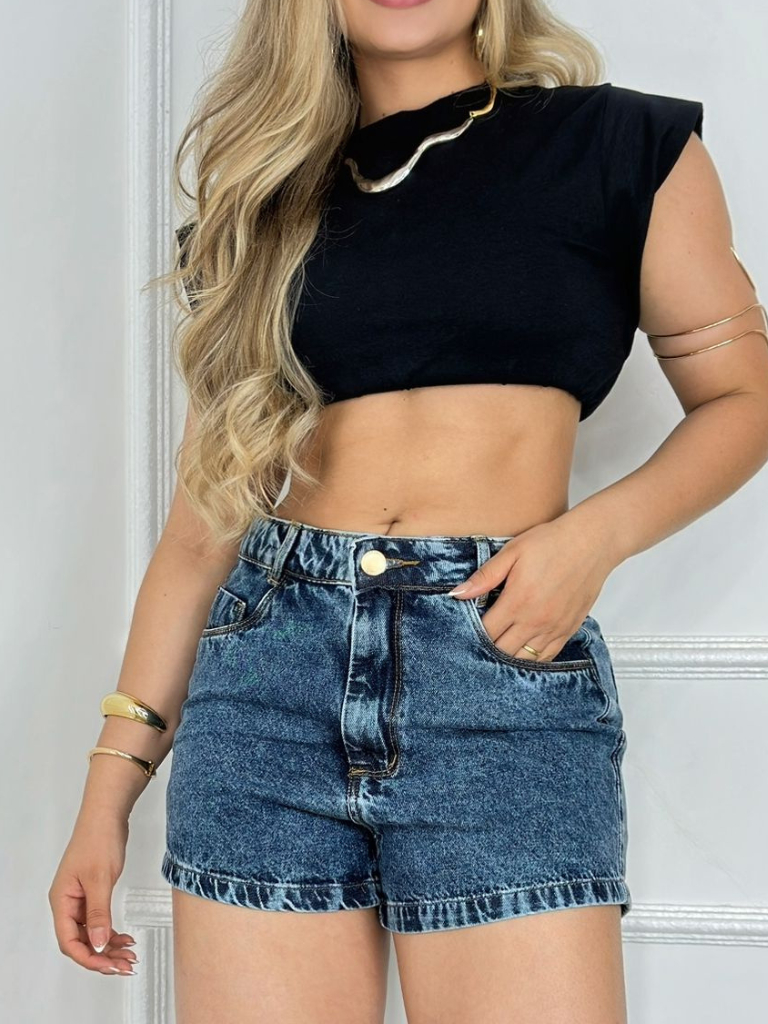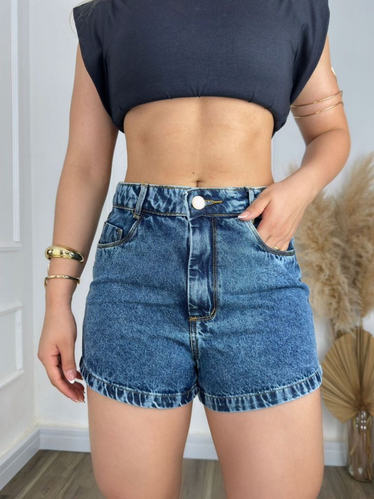 Short Jeans Feminino Cintura Alta Bermuda com Barra Cós Alto Premium Sem Elastano 100%Algodão Sem Desfiado Marmorizado