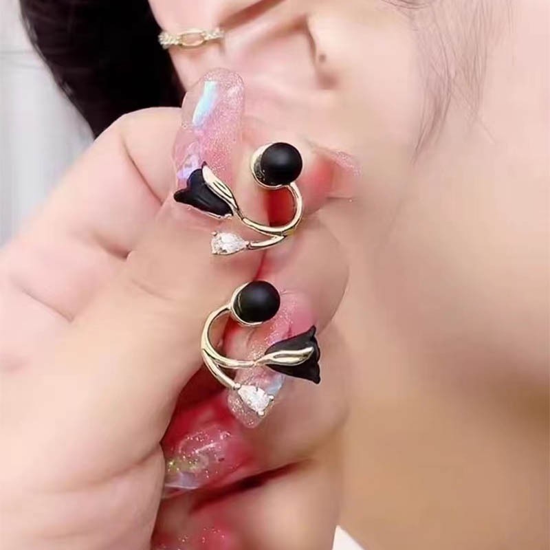 Brincos De Tulipas Pretas , Design 2 Em 1 , Jóias De Orelha Elegante & Chic , Acessórios De Moda Feminina