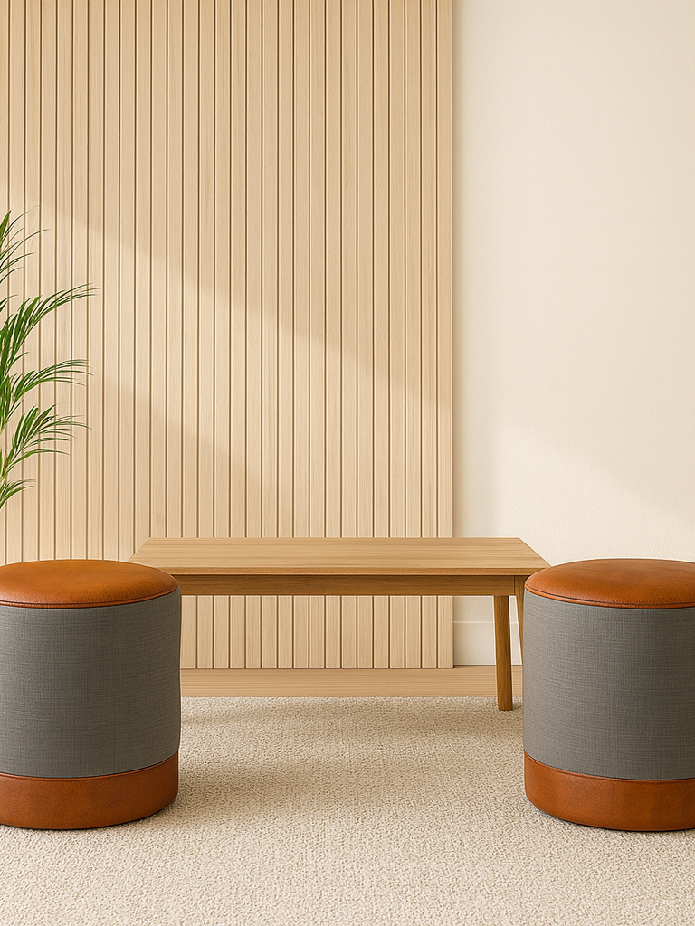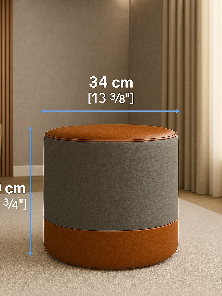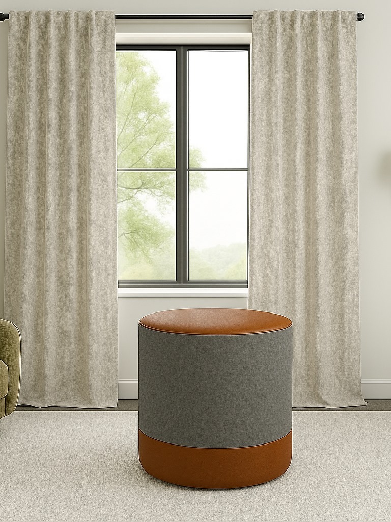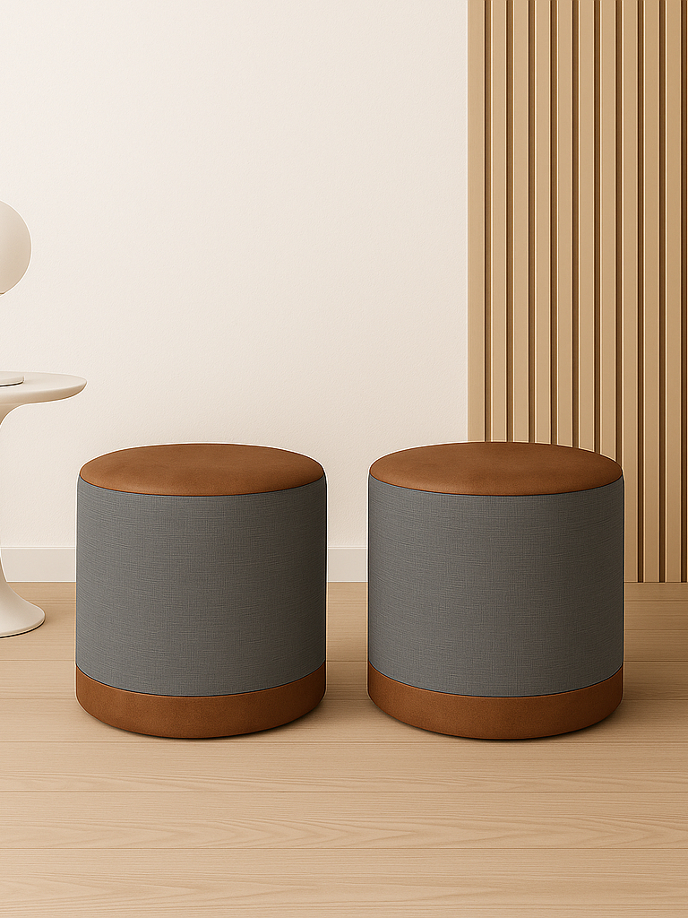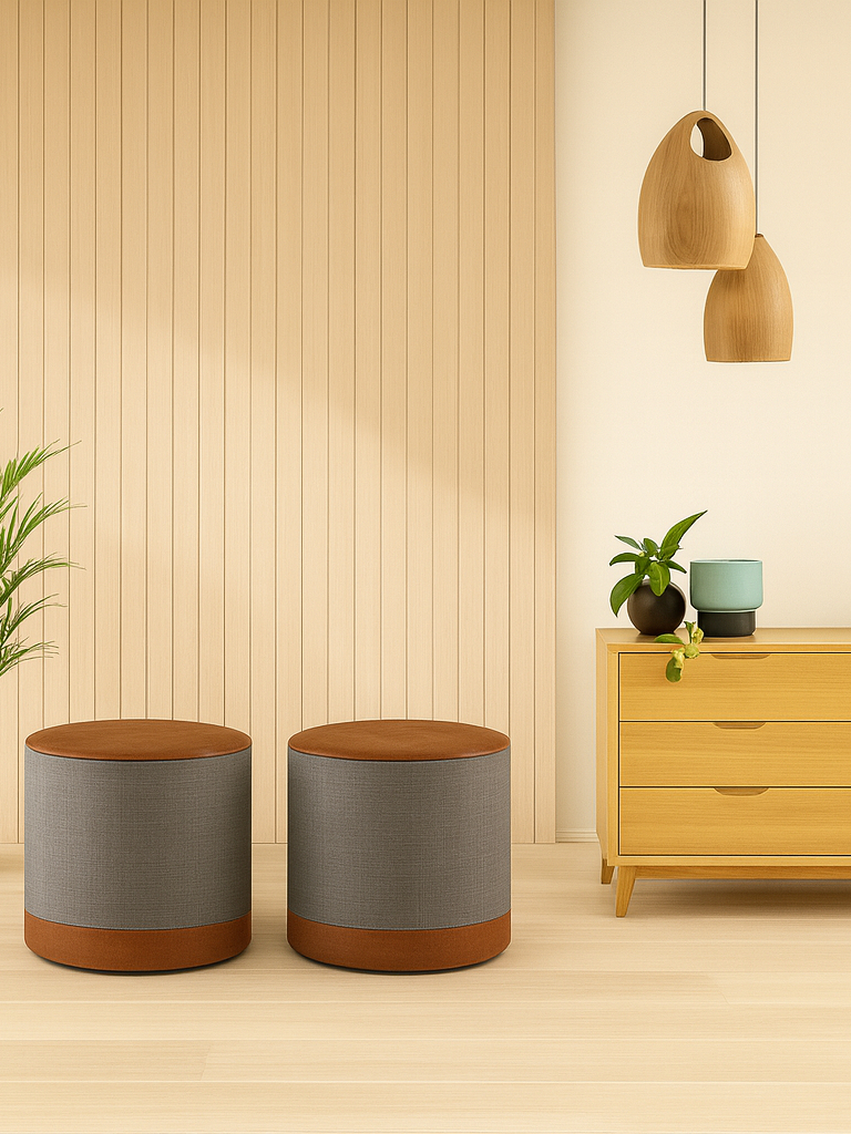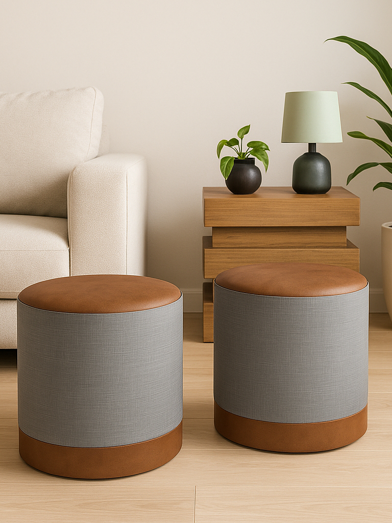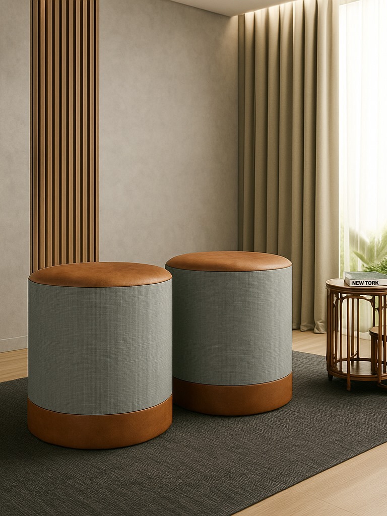 Kit 2 Puff Redondo Cilindro Em Couro Caramelo Linho Cinza