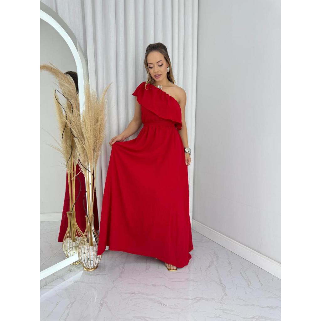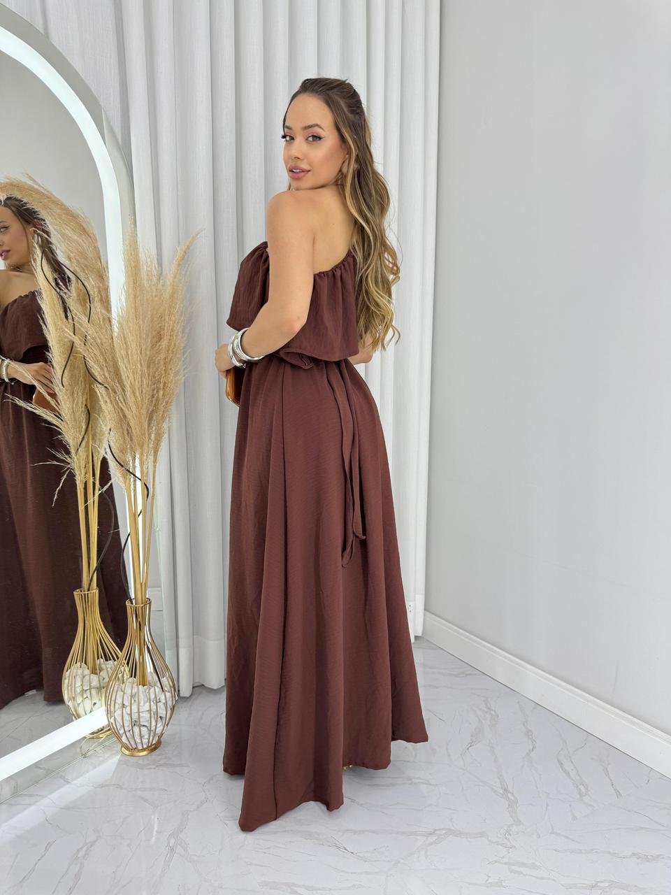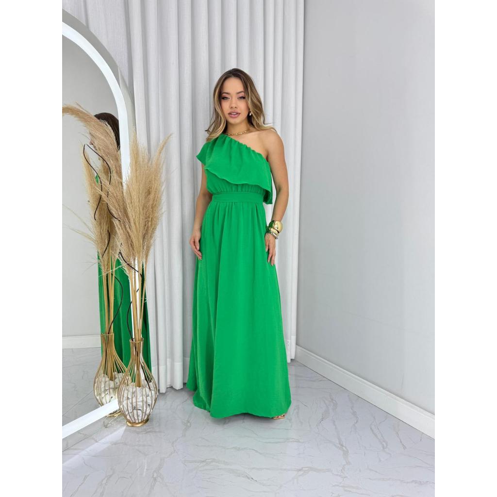 VESTIDO LONGO NULA MANGA BABADO COM CINTO ELEGANTE
