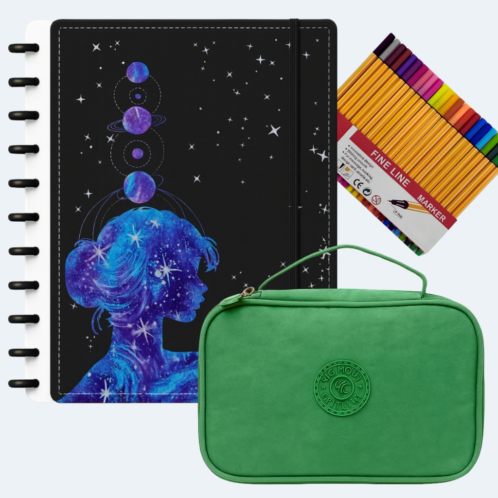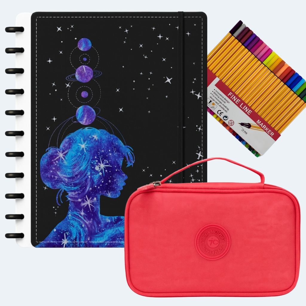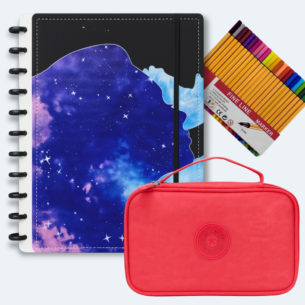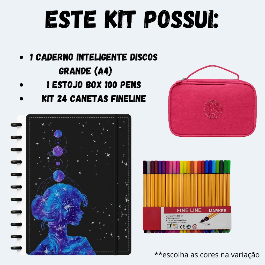 Kit Material Escolar com Estojo box 100 Pens Caderno de Disco Inteligente e Kit Caneta Fineline