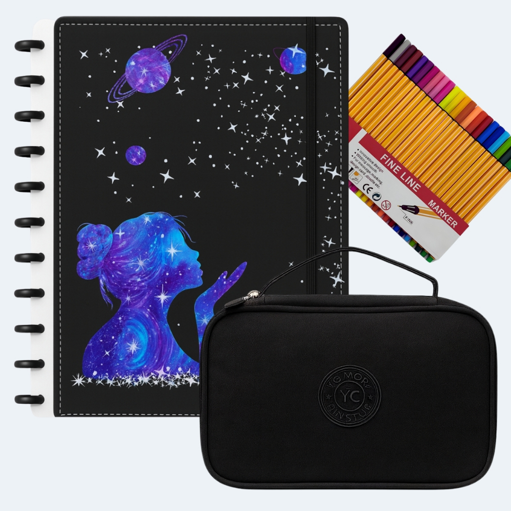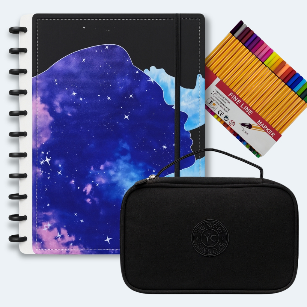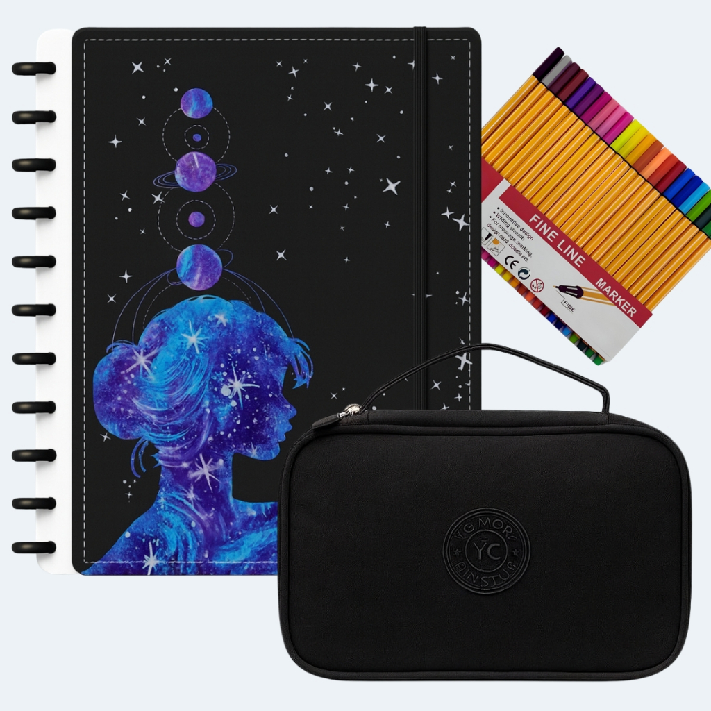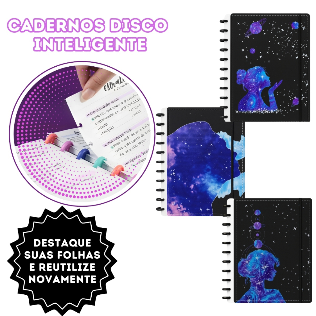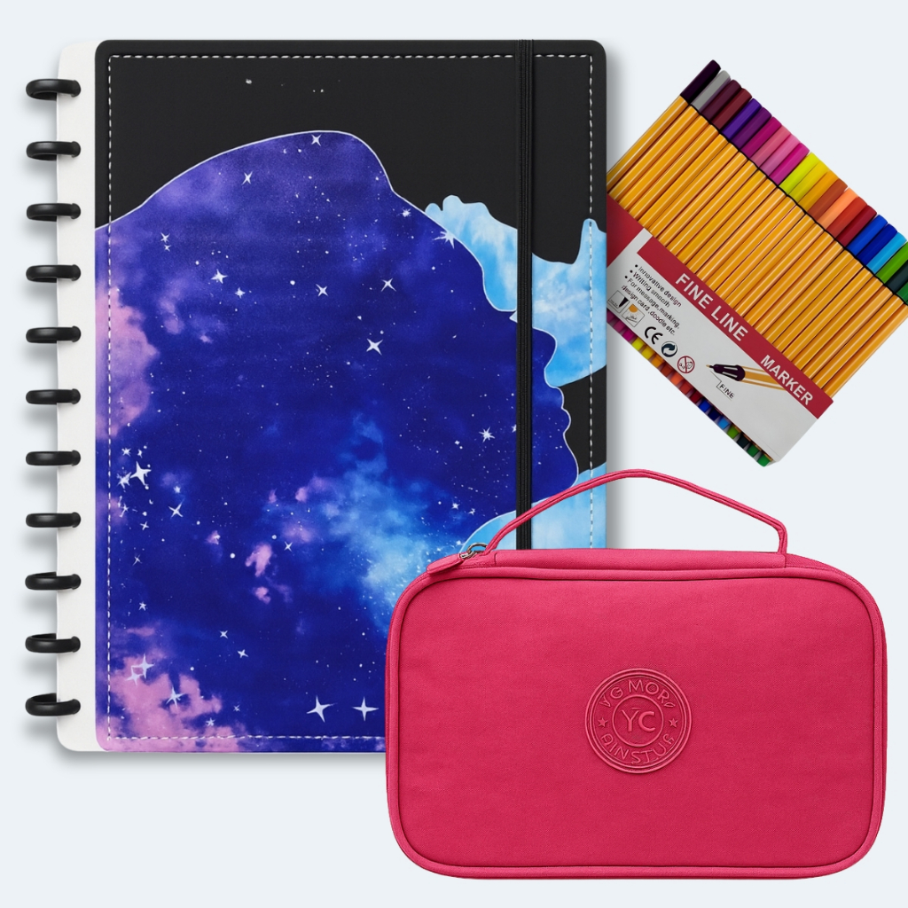Kit Material Escolar com Estojo box 100 Pens Caderno de Disco Inteligente e Kit Caneta Fineline