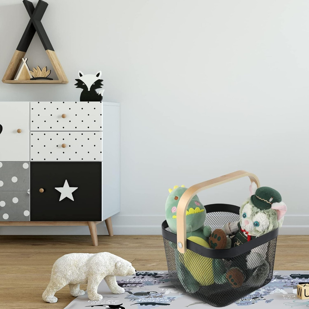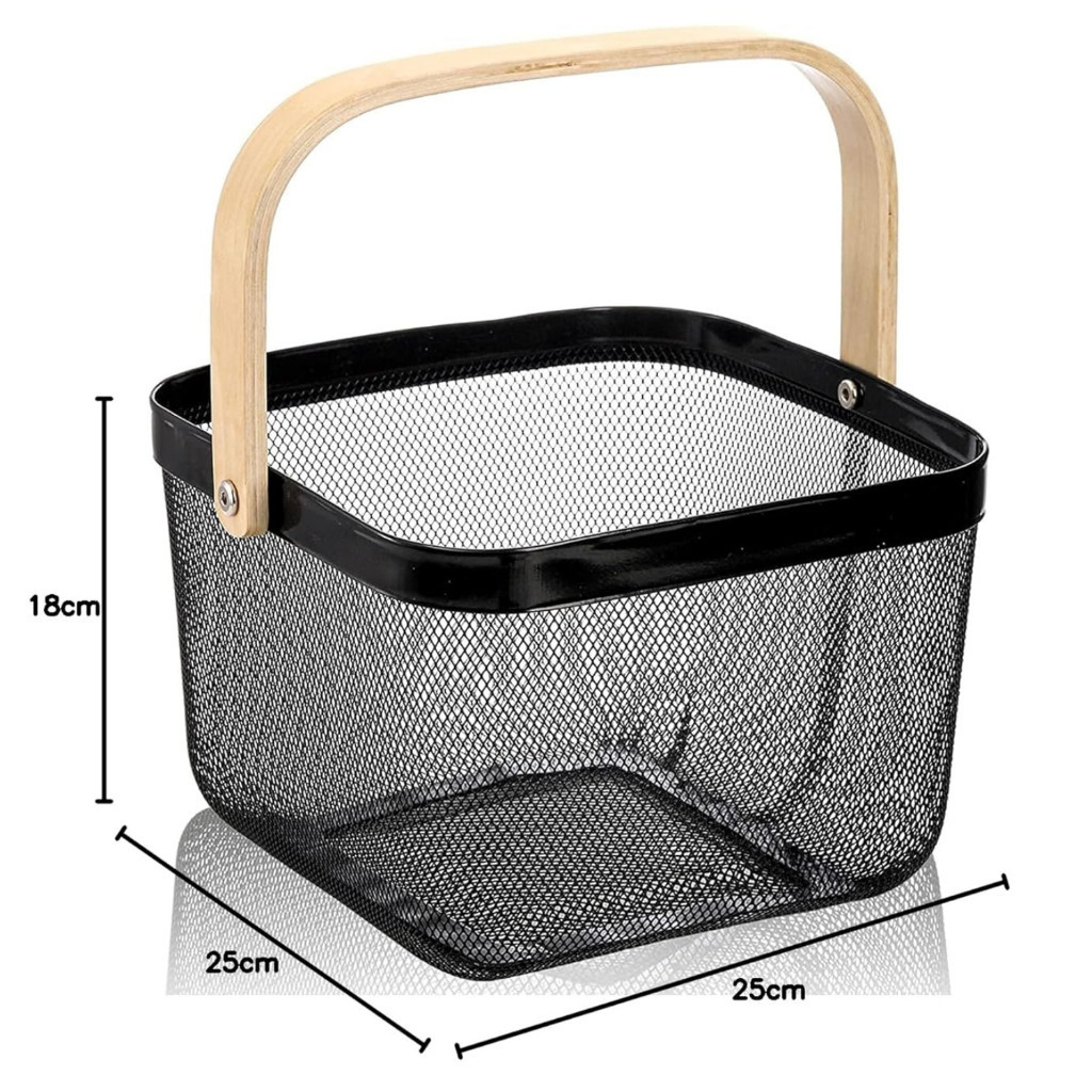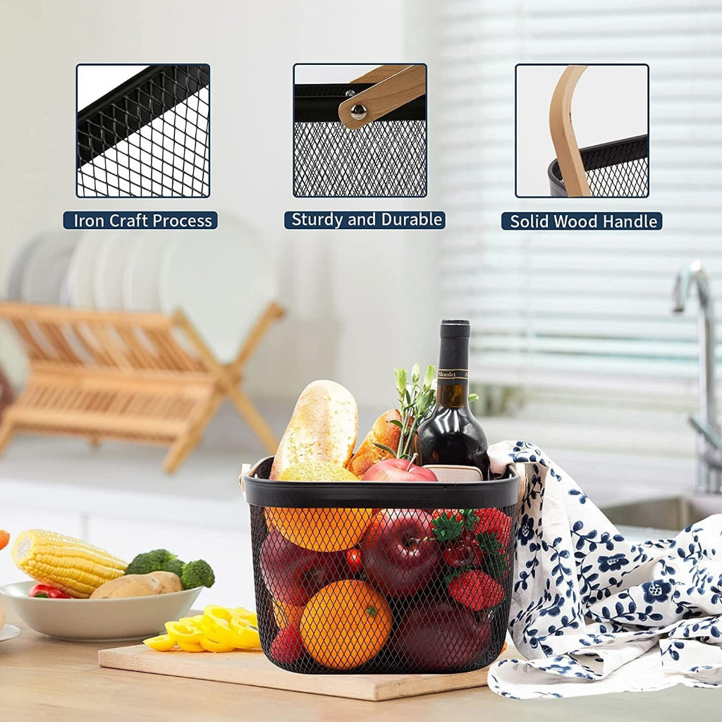 Cesto de Armazenamento Aramado Fruteira Multiuso em Metal com Alça de Bambu