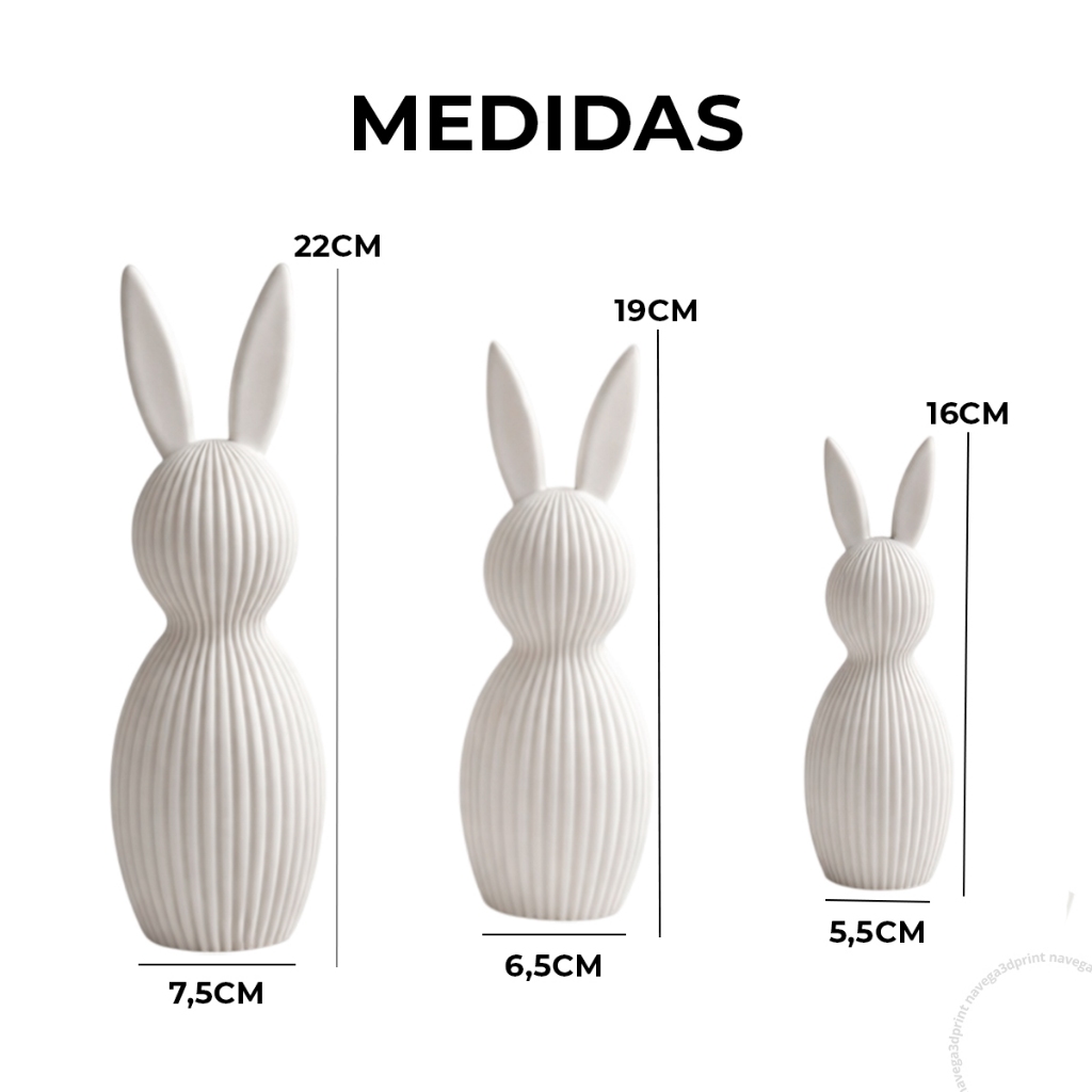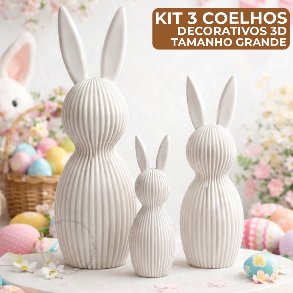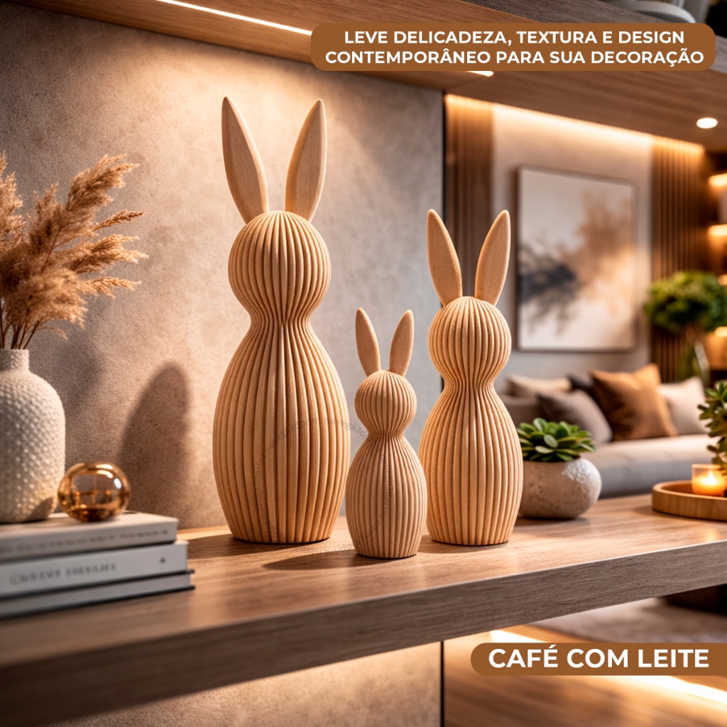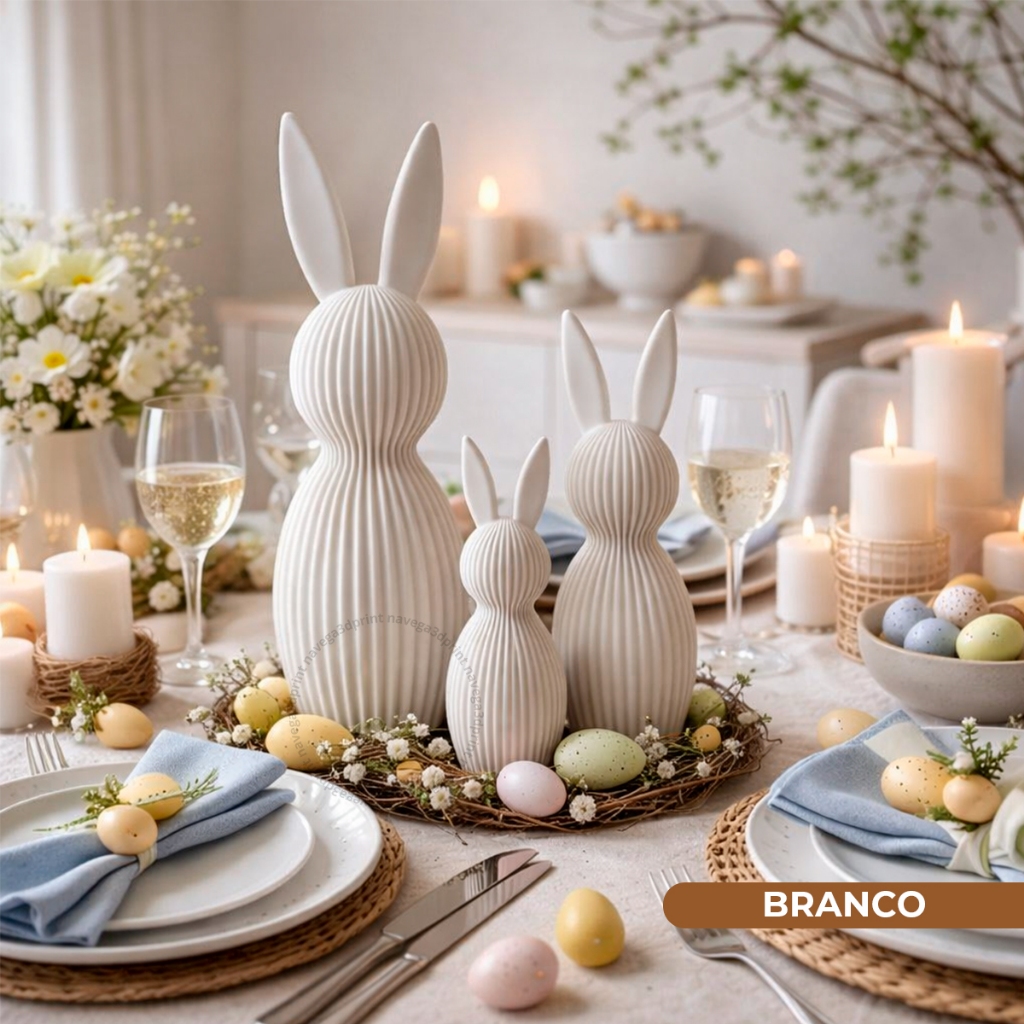 Kit 3 Coelhos Páscoa Enfeite Tamanho Grande Decoração 3D Moderno Minimalista Canelado