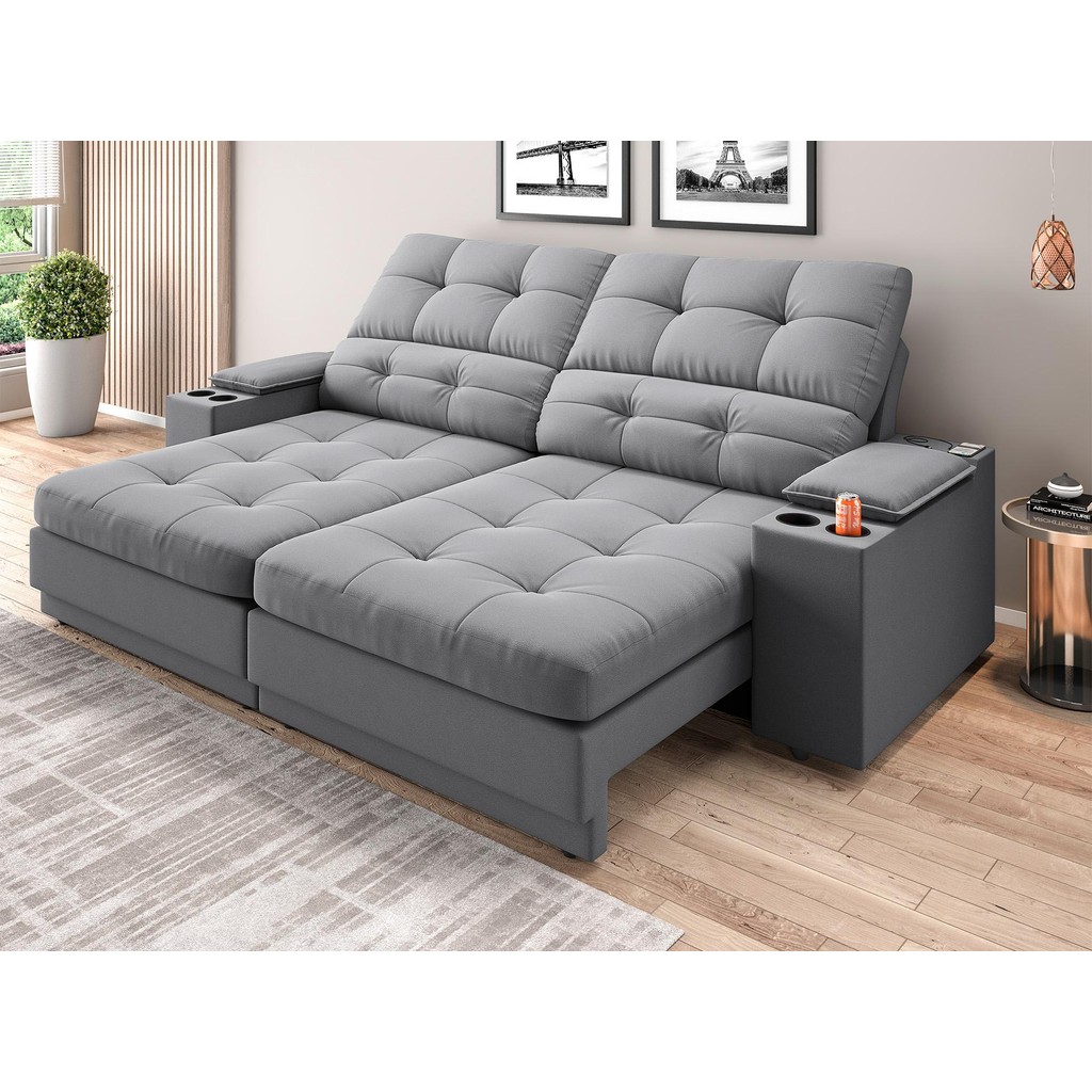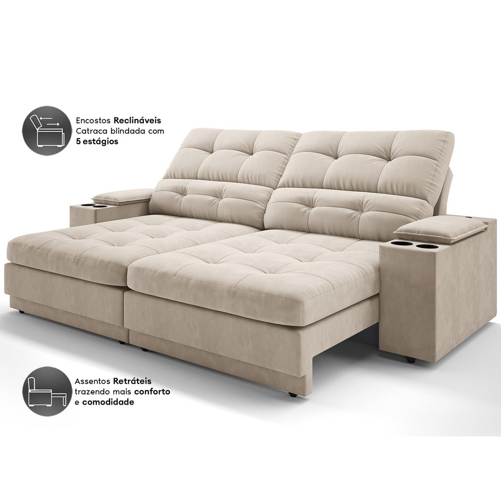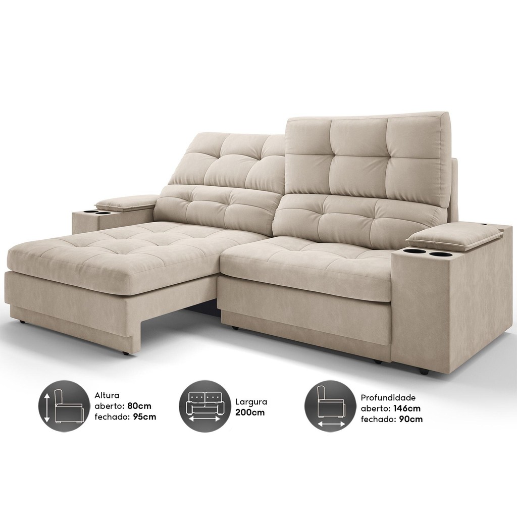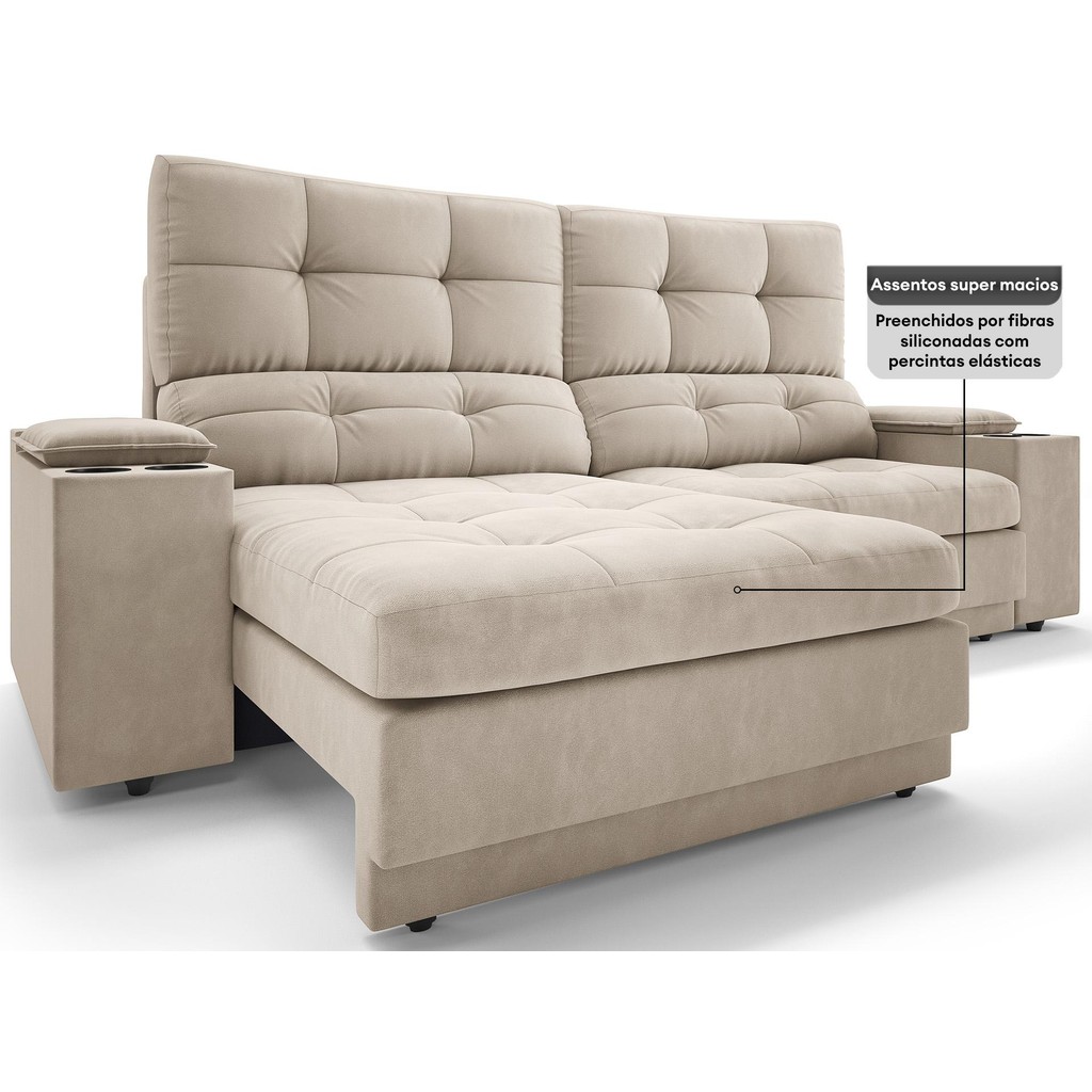 Sofá com Porta Copos e Carregador USB Eureka 2,00m Assento Retrátil e Reclinável Velosuede - NETSOFAS
