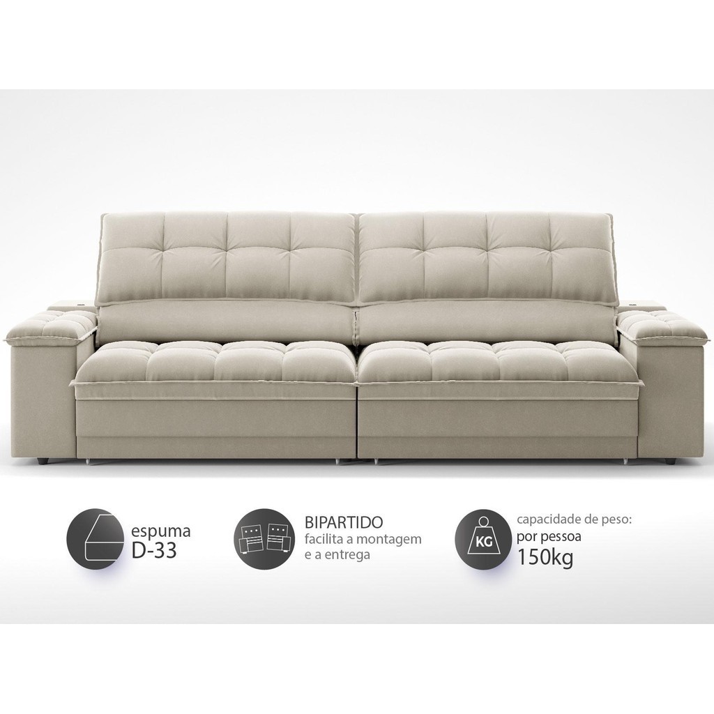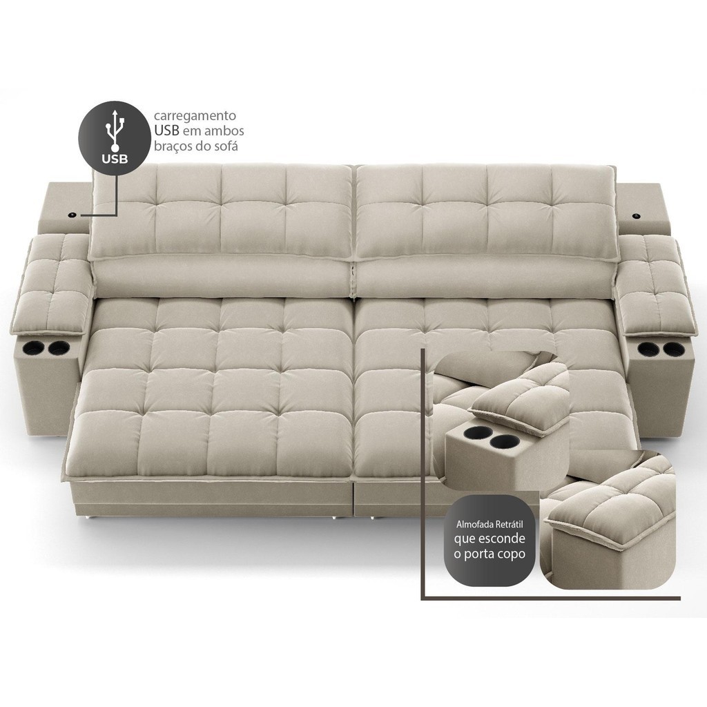 Sofá com Porta Copos e Carregador USB Ret Rec Luke 2,50m Veludocristal Areia - NETSOFAS
