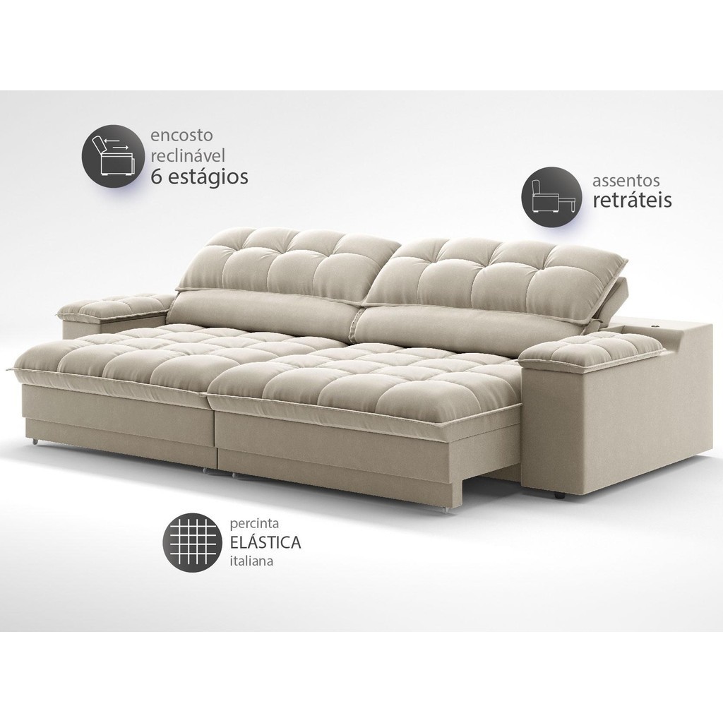 Sofá com Porta Copos e Carregador USB Ret Rec Luke 2,90m Veludocristal Areia - NETSOFAS