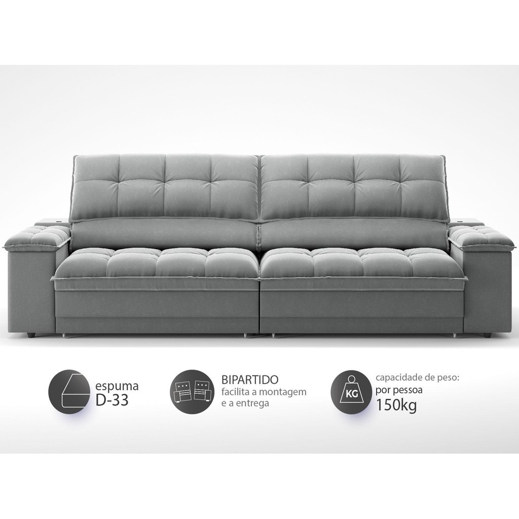 Sofá com Porta Copos e Carregador USB Ret Rec Luke 2,10m Veludocristal Cinza - NETSOFAS