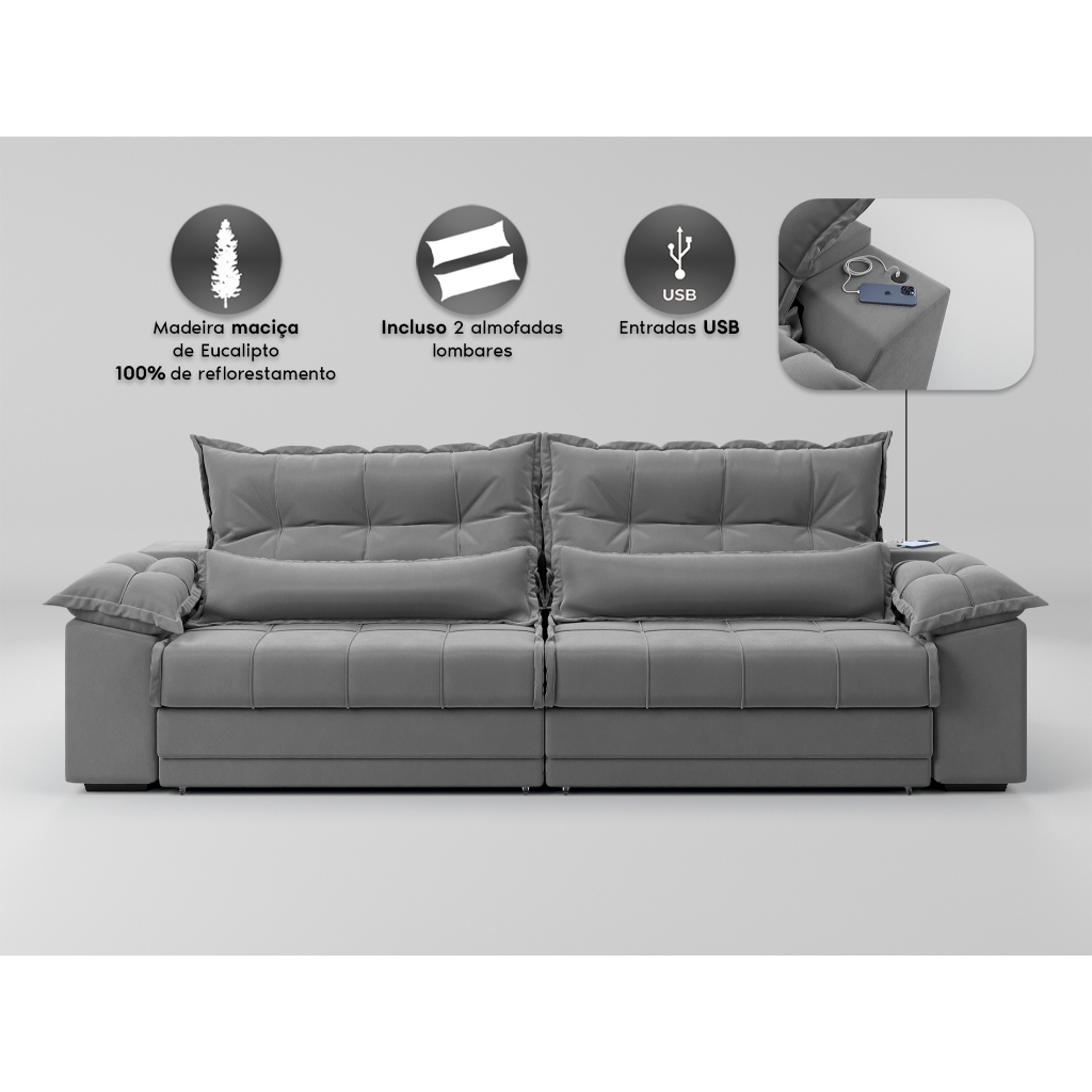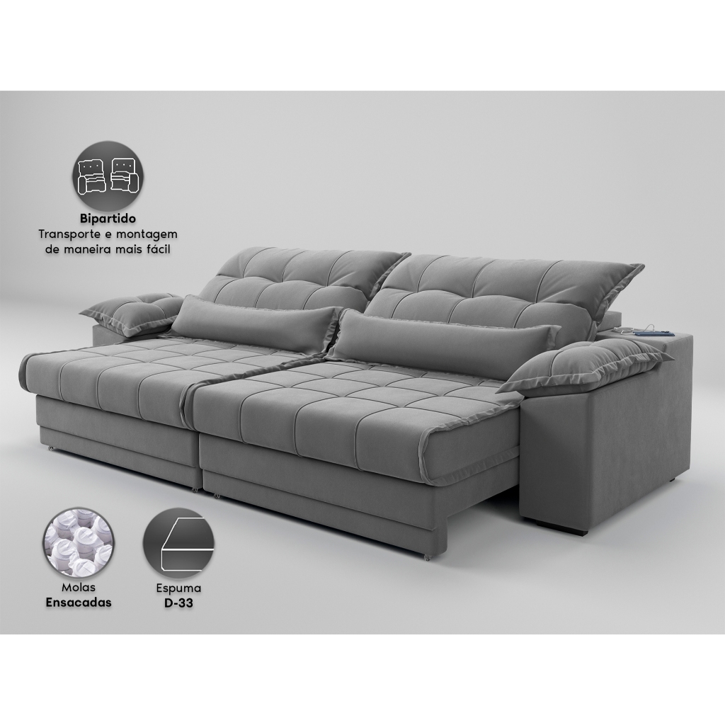 Sofá Retrátil e Reclinável com Molas ensacadas e Carregador USB Colosso 2,30m Veludocristal Cinza - NETSOFAS