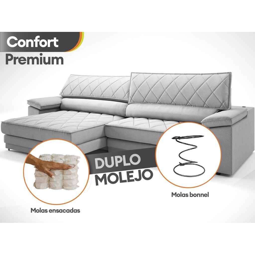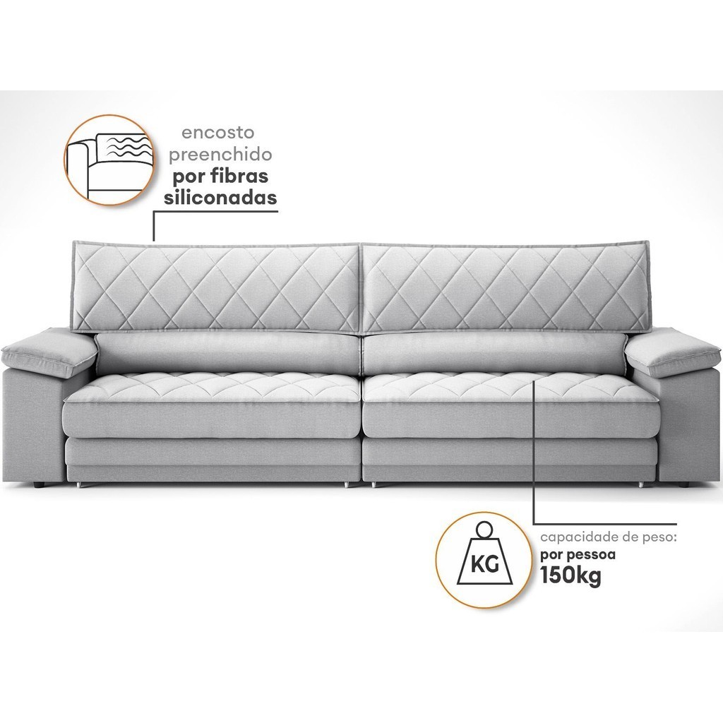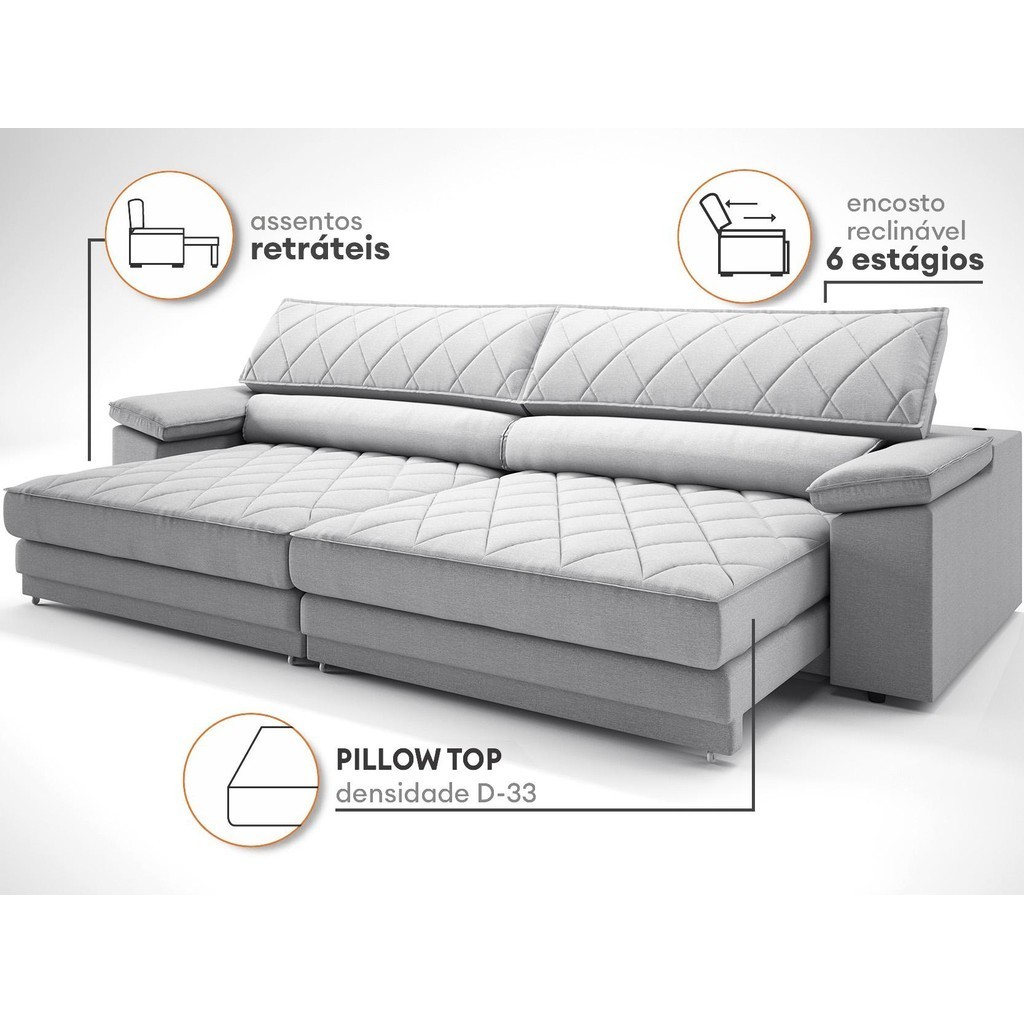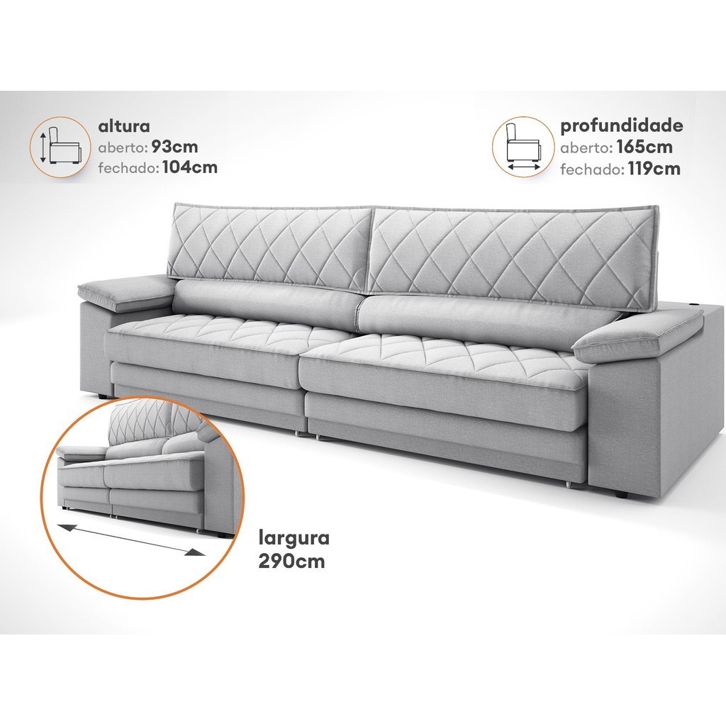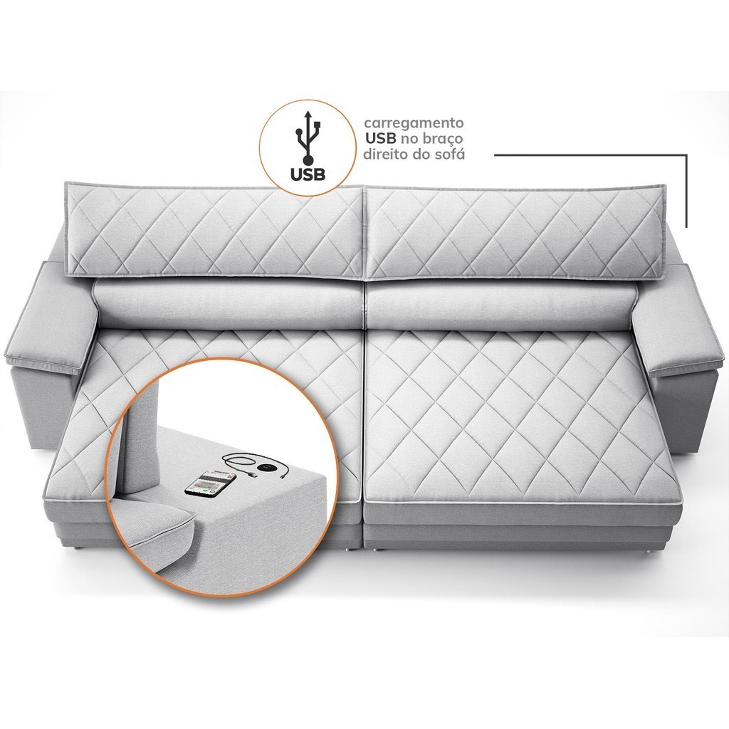 Sofá de Duplo Molejo com Carregador USB, Retrátil e Reclinável Valencia 2,90m Linho Soft Prata- NETSOFAS