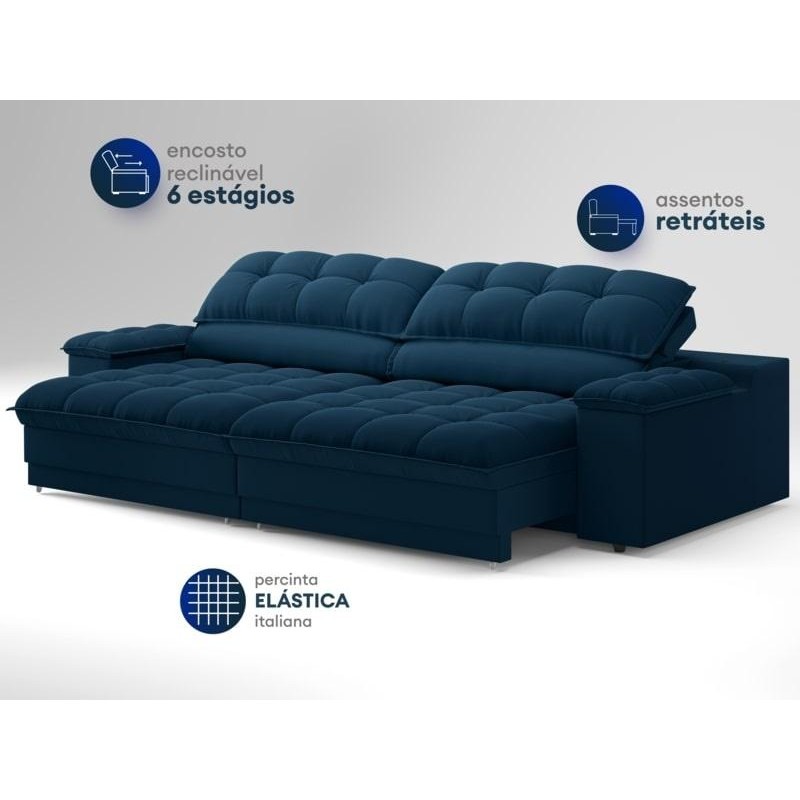 Sofá com Porta Copos e Carregador USB Ret Rec Luke 2,50m Veludocristal Azul Marinho - NETSOFAS