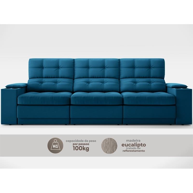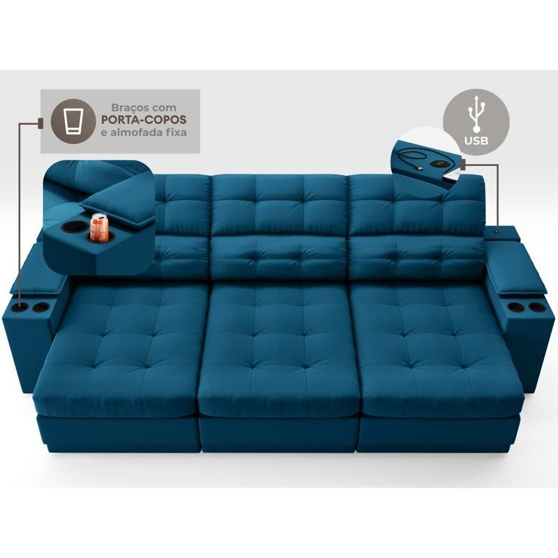 Sofá com Porta Copos e Carregador USB Eureka 2,30m Assento Retrátil e Reclinável Velosuede Royal - NETSOFAS