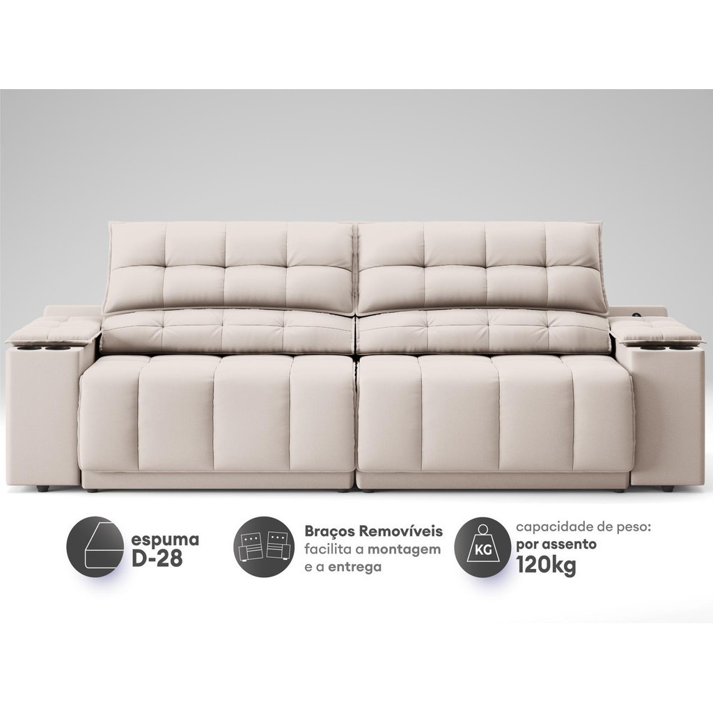Sofá com Porta Copos Carregador USB Ret Rec Samurai 2,30m Velosuede Areia - NETSOFAS
