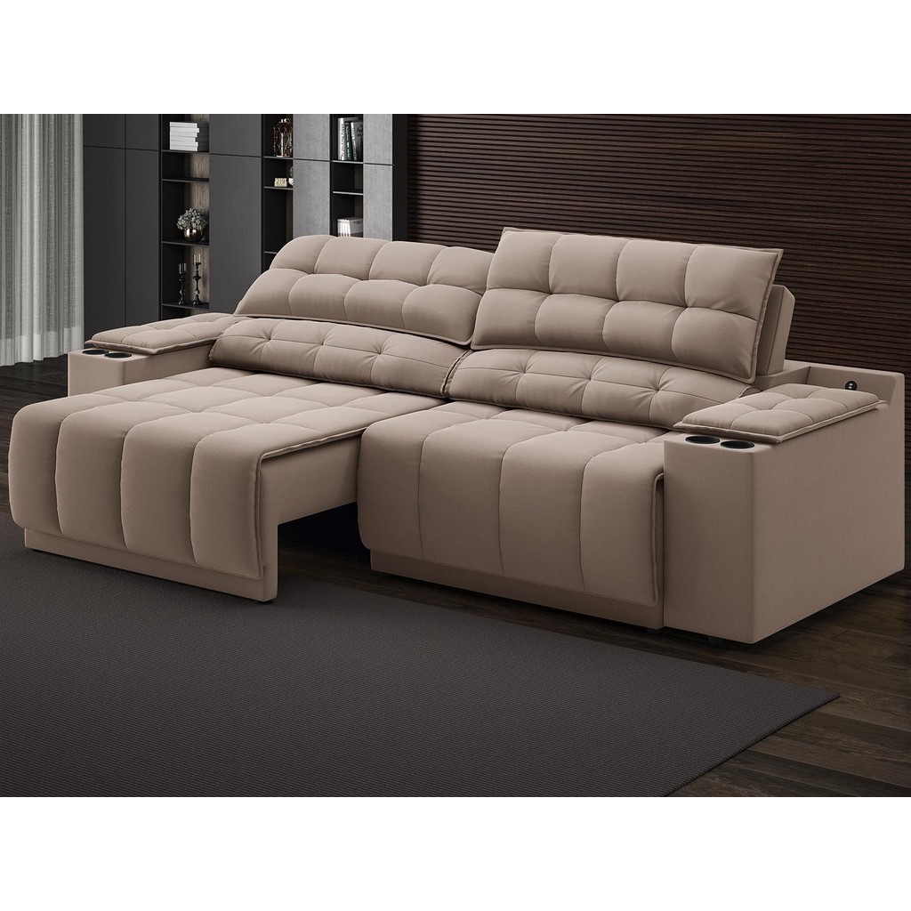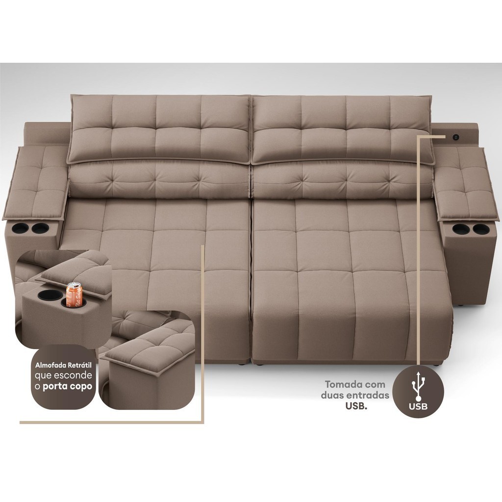 Sofá com Porta Copos Carregador USB Ret Rec Samurai 2,50m Velosuede Marrom - NETSOFAS